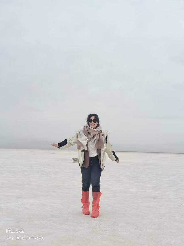 穿上五元租来的盐田专用鞋,火红火红的颜色走在纯白的天地间格外显眼。遇见一群从广东自驾过来的靓仔(别问我怎么知道,我的社交能力我都怕),拉着他们咔咔就是一顿猛拍!伤心的是他们的拍照技术太烂,结果他们得了一堆我帮忙拍的,好看的照片。而我找不到一张能发朋友圈的。幸好老天眷顾,跟靓仔们分开后,给我遇见一个孤身一人扛着部单反的小哥哥,硬把社恐的他聊成兴奋互拍的朋友,我纠他的摆拍姿势,他纠我的构图设计。