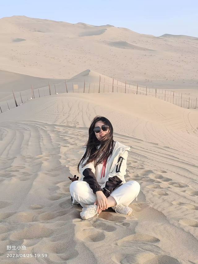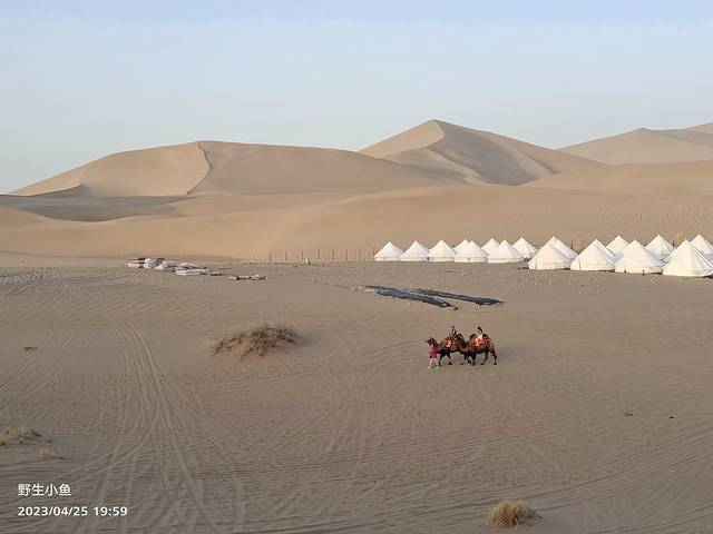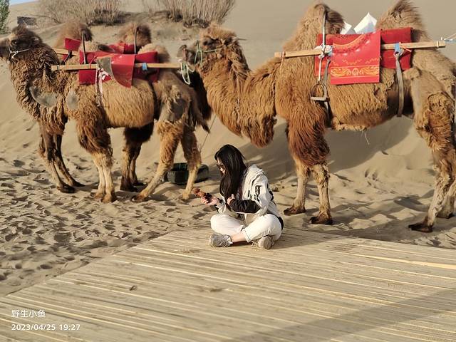 到达露营地,我下了车套上沙漠鞋套,趁着落日余晖,吭气吭气爬上沙丘顶。总算见到沙漠,一片金黄的海洋,每一粒沙子都像是被太阳吻过的精灵,闪烁着耀眼的光芒。在夕阳的照射下,金黄色的沙丘犹如波涛汹涌的海浪,流动着无尽的韵律。在这片无垠的广阔中,我感受到了自由与豪迈的交织。沙漠、蒙古包、骆驼队,还有灿烂的夕阳,这一刻浮现脑海的是王维的“大漠孤烟直,长河落日圆”,多么有幸看见千百年前的景象。感慨完艰辛的趟下沙漠,我累得气喘吁吁,凑在休息骆驼边拍照,被骆驼一个喷嚏吓出了双下巴。