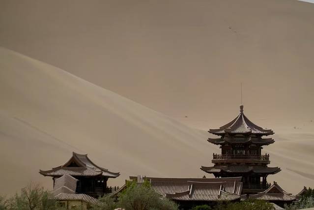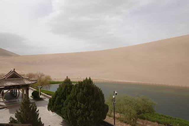 山泉相依处,依山傍泉矗立着一座八角形的四层塔,名曰“月泉阁”,其设计借鉴了敦煌壁画的建筑特征,采用对称布局和回廊环绕楼阁层出的手法,外观呈灰黄色,与沙漠环境和谐统一。由于旅游业的发展,月泉阁里有供游人休憩的地方,并且还有餐食及饮品售卖。在这里歇脚时,结识了一位同频共振的佛山女孩,拍照还超厉害,一个人一部车畅游西北,超赞!