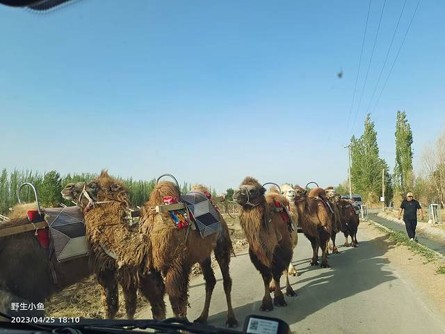 下一站的目的地是-鸣沙月牙泉,但由于时间过晚,我们决定明天再去好好游玩一番。今天晚上就去沙漠里好好蹦个野迪吧!去往露营地的途中,与一驼队相遇,第一次近距离见到庞大的骆驼队伍,我满心兴奋。它们安静乖巧的听从主人的指挥,慢慢挪到路旁,让我们车队先过去。实在太可爱了。