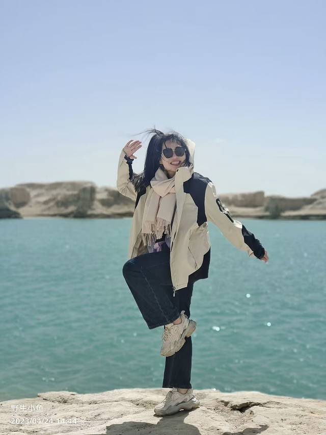 深绿色的湖泊犹如一块美丽的翡翠镶嵌在荒凉的戈壁之上,温柔与孤寂共舞。行走在湖边,远处的风蚀林好像浮在湖面上的海市蜃楼,不似真实的。