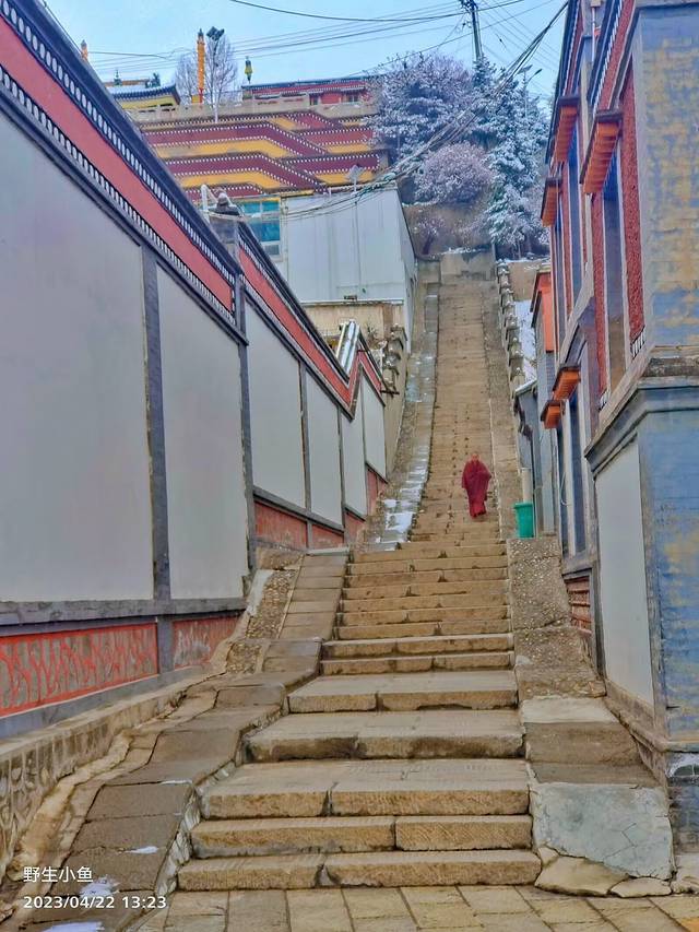 大门紧闭的塔尔寺,一来就给了我们一下马威。第一次看见雪后盛开的樱花,以为即将无功而返的我们,还是兴致勃勃的在门口街道的樱花树下游玩,互相拍照。遇见三五个过来兜售拜佛贡品(一些香和酒)的当地小孩,正意外着他们怎么不用上学,发现不远处一个原著小男孩,脸颊冻得通红,黑色的绒毛巾圈住脖子,手里提着几个同款沉甸甸的塑料袋。安安静静地站着,没有向路人兜售自己的物品,与他对视的片刻,我仿若看见了闪着光芒的琉璃!我刻意朝他走去,经过他身前时,他默默的看着我。我是个热烈的急性子,等不及慢慢试探,直接冲他开口询问“你们怎么不用上课?”他收回意外的目光用方言回应我,见我一脸茫然,再次用磕磕碰碰的普通话解释一番,但我嘛只确定他是在跟我解释,没上课的原因我还是没弄清楚,我也不纠结,翻出包里的牛肉干递了过去,迎着那茫然的纯真眼神,我直接把牛肉干塞进他冻红的手里。我们凑在一起啃完牛肉干,小男孩用蹩脚的普通话告诉我,旁边有个侧门可以进入塔尔寺,于是我大方的表示要全部买下他手里的贡品,也是个可爱的孩子,他跟我解释一人一份贡品就够了,只卖给了我一份,价格还比旁人便宜!西宁的初印象,小男孩占了浓墨重彩的一笔。