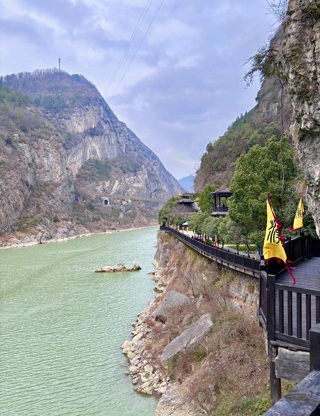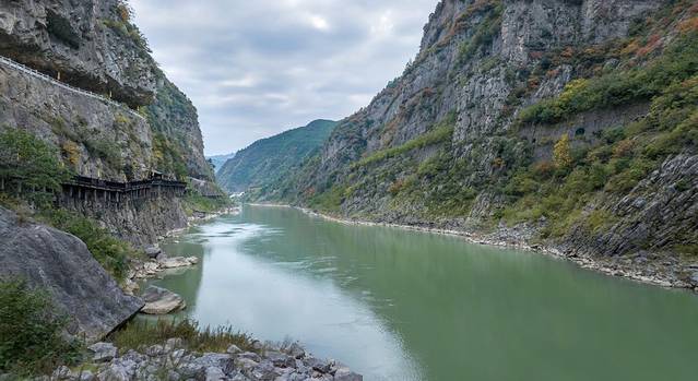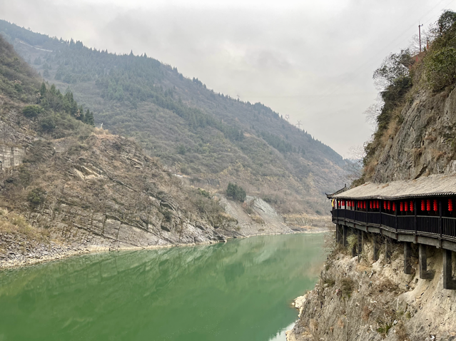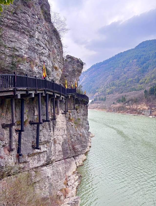 栈道是在崖壁上凿孔架木修建,有些倾斜,两边是壁立的石崖,绝对不平稳但也不是很险峻,跟普通栈道相比不一样就是了,清澈的嘉陵江水在谷底潺潺流淌,体验感还是很好的。