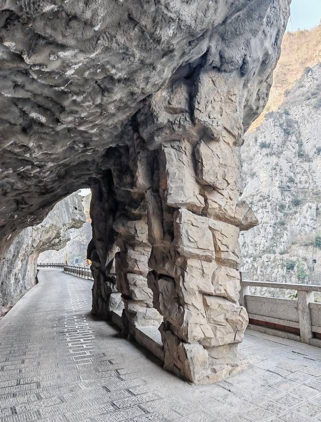 中途会路过几处洞穴,还有可休息的亭子,充满了古韵,栈道旁整齐划一的旗帜也是栈道上的一道独特的风景线。