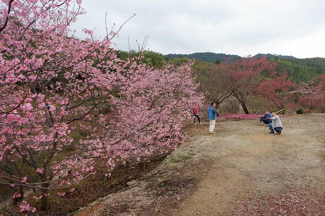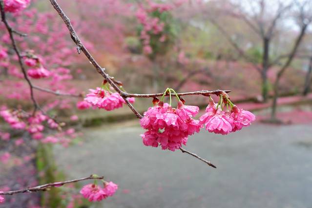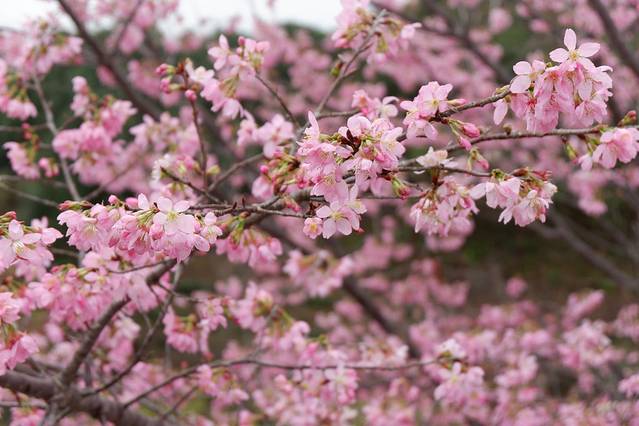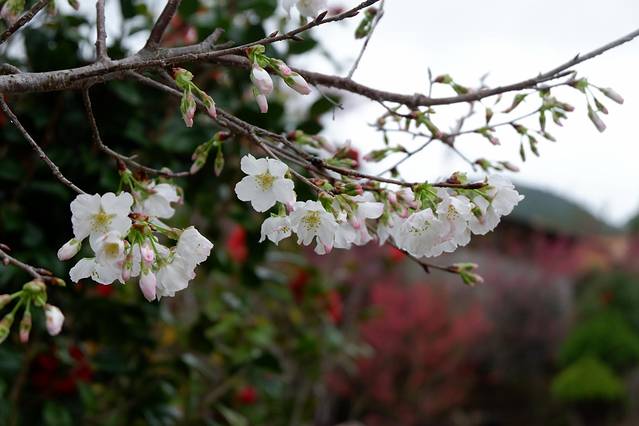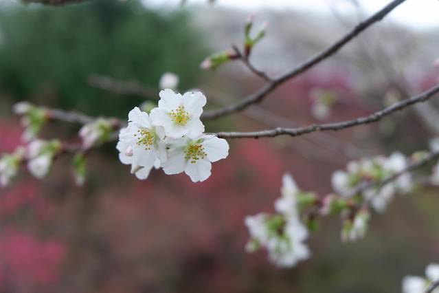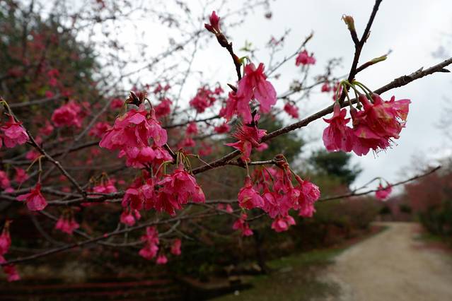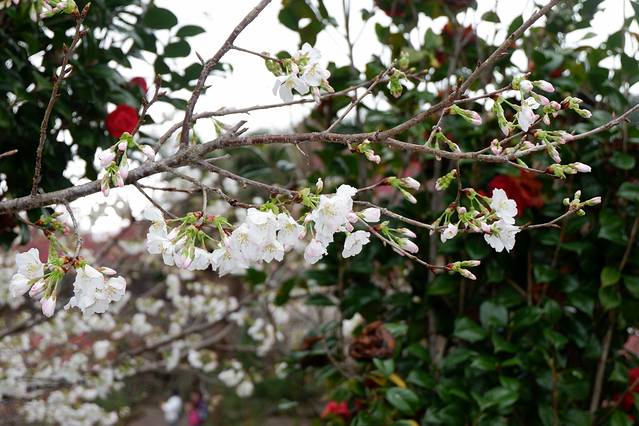 区内的樱花品种有20多种,其中种植八重樱和寒绯樱居多。八重樱花色白色至深粉红色,开花较迟,由于有八重花瓣,称之为八重樱。而最早开放的是寒绯樱花,花朵呈鲜红色,适应温暖地区,更耐寒,1月下旬已盛开。