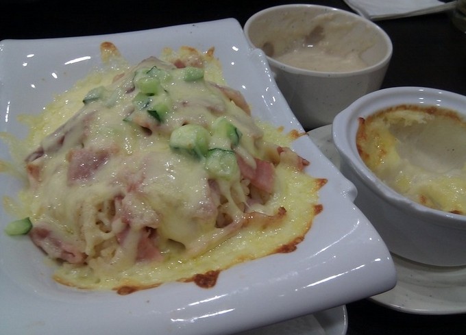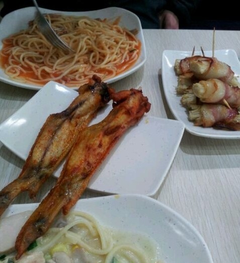鸡蓉蘑菇汤味道不错,浓郁,比较喜欢,芝士土豆泥也挺好吃,芝士给的不少,土豆泥调味稍微淡些。烤鸡翅有些干、硬。意大利面的番茄酱应多加一点,味道才浓。芝士焗饭 满满的都是芝士,真的是会拉丝。推荐芝士土豆泥,满满的一碗,还满香的。