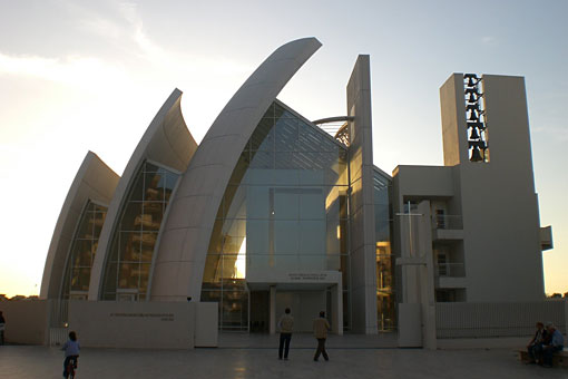 这个教堂是后来建造的,我在意大利的时候还没有,后来也特地去看过,风帆样的建筑,有点像悉尼歌剧院。