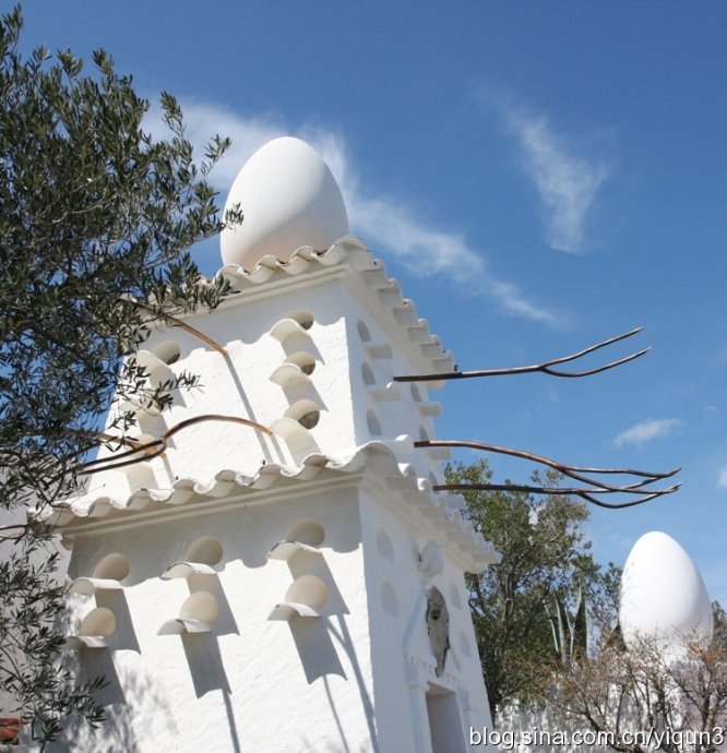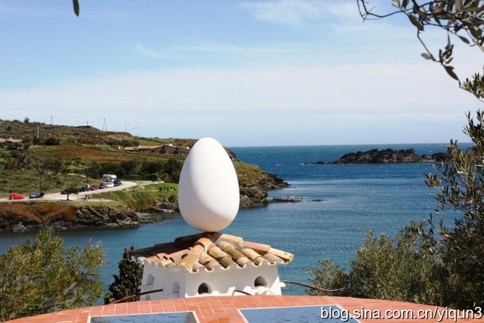 在达利的家乡和博物馆,看到许多蛋:大蛋,小蛋;竖蛋,横蛋;整蛋,破蛋;蛋的原形,蛋的变异,有的在橱窗里,也有的落在墙上甚至屋顶上---别出心裁的达利风格。在卡达凯斯附近,达利夫妇住过四十年的家.屋顶上的两个大蛋,在蓝色海湾的映衬下,显得优雅端庄,洁白无瑕,傲立人间.有人说,达利就是蛋.这话让我揣摩了许久,难以找出准确答案.