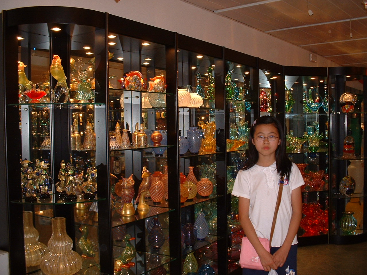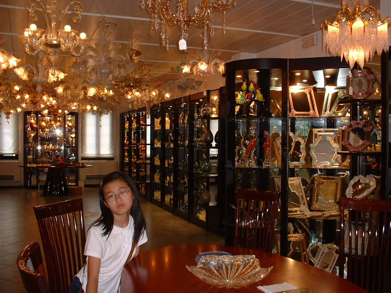 美丽的水晶工厂 乘船穿过海峡,来到另一块陆地,这里有著名的水晶工厂,当场表演烧制水晶制品的工人,技术娴熟,包含着无数种类的技术含量。 最让人爱不释手的是那些五光十色的玻璃器皿,那些颜色是无法用语言形容的,特别是仿生器皿,更是巧夺天工,无与伦比,真是越看越爱。 买了一些纪念品,与一位销售人员交流了纪念品,表达了孩子子对威尼斯的留恋。 一块水晶制造的仿生糖,虽然简单,但是栩栩如生,一看就不由自主地想把它放进嘴里,流出口水。 晚霞已经在西边露脸,回去的船已经静侯在工厂的专用码头,我们只好打道回府了,再见了,威尼斯。