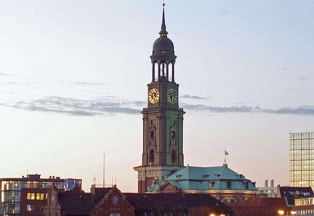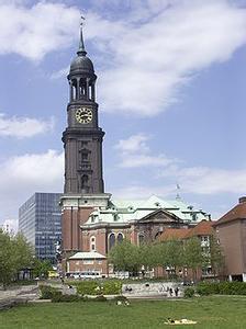 钟楼是这座教堂的标志,登上钟楼能将整个汉堡的市容尽收眼底,所以每天都有人排队等候一台保持着古风的缓慢电梯将大家运送到钟楼平台去观赏风景。这座华美的巴洛克式教堂内部非常敞亮,毫无阴郁之感。挑高的穹顶起到了完美的扩音效果,这一点甚至吸引了一些合唱团来教堂灌录唱片。这里也是作曲家勃拉姆斯的受洗之地,教堂至今保留着为勃拉姆斯施洗的水盆。 夏季的中午,教堂会演奏管风琴,那雄浑悠扬的管风琴音在教堂穹顶的作用下听起来更为圣洁嘹亮,非常值得为此驻足。