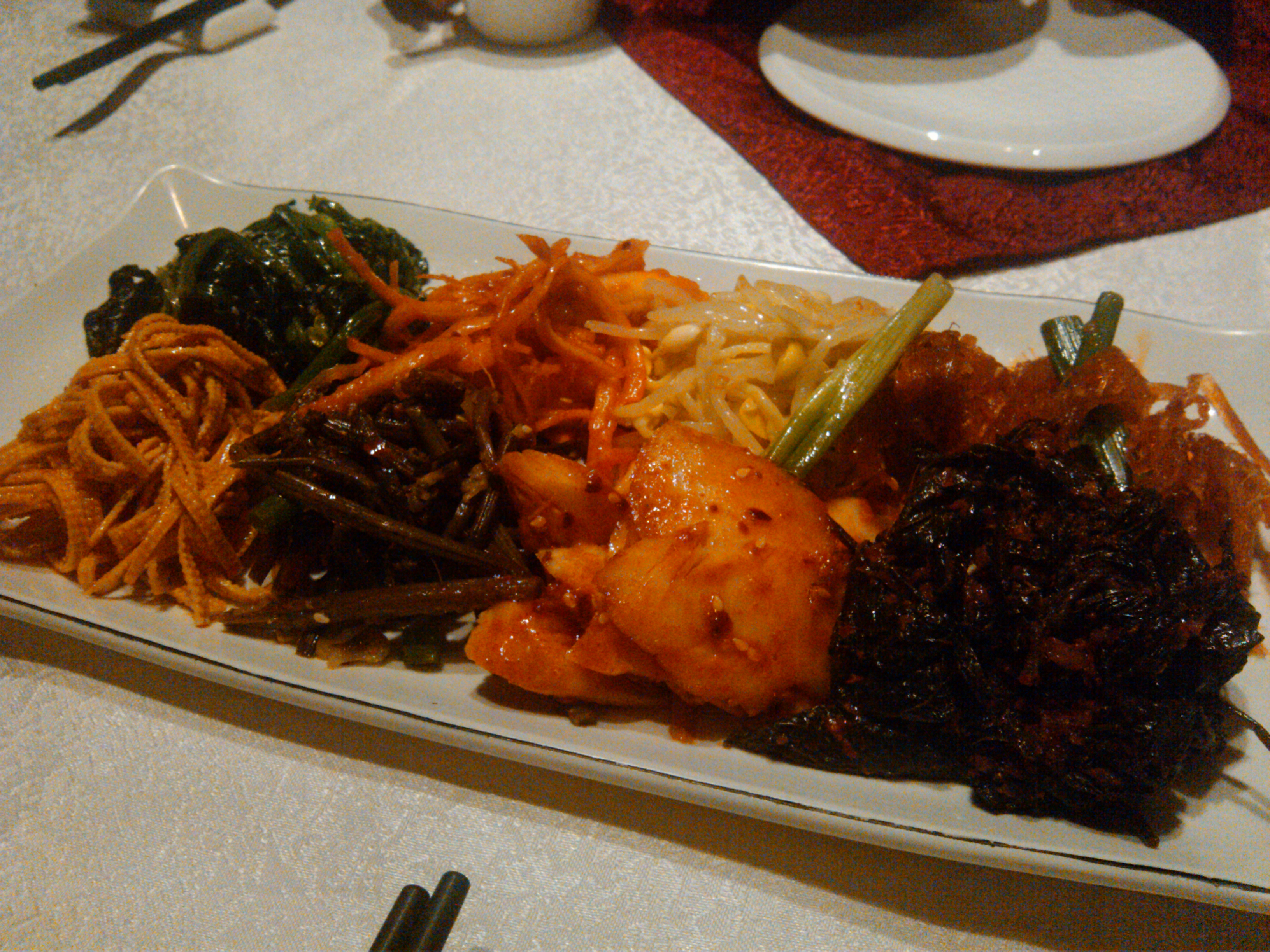 要的烤兔、麻辣鳕鱼、烤明太鱼、泡菜和海鲜饼、打糕、狗肉炖豆腐等。 合菜是我最喜欢的,酸甜可口