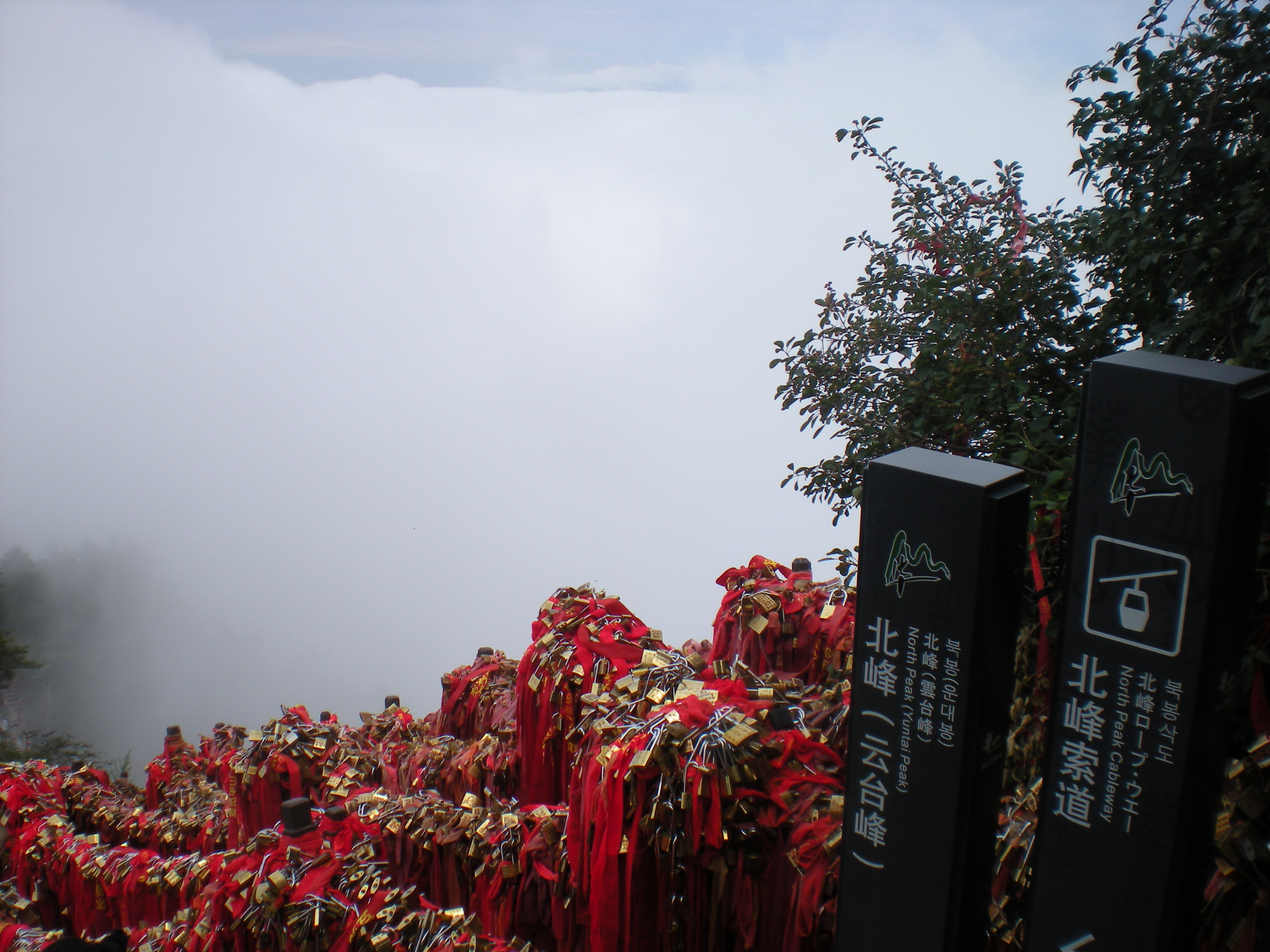 关内关外登山路两侧铁索上挂满的情侣锁、平安锁重重叠叠,红绳彩线迎风摇曳,也是关前一道美丽的风景上北峰,过了苍龙岭就到了金锁关,上了金锁关就到处都是路了,东南西峰任你去。关内关外登山路两侧铁索上挂满的情侣锁、平安锁重重叠叠,红绳彩线迎风摇曳,也是关前一道美丽的风景。