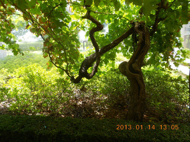 终于看到了品酒的院子,一进去院子的外面有一个品酒的酒座,四周都有喷嘴喷着水蒸汽,喷向葡萄架。白白的水雾,一下就感觉凉爽下来,
