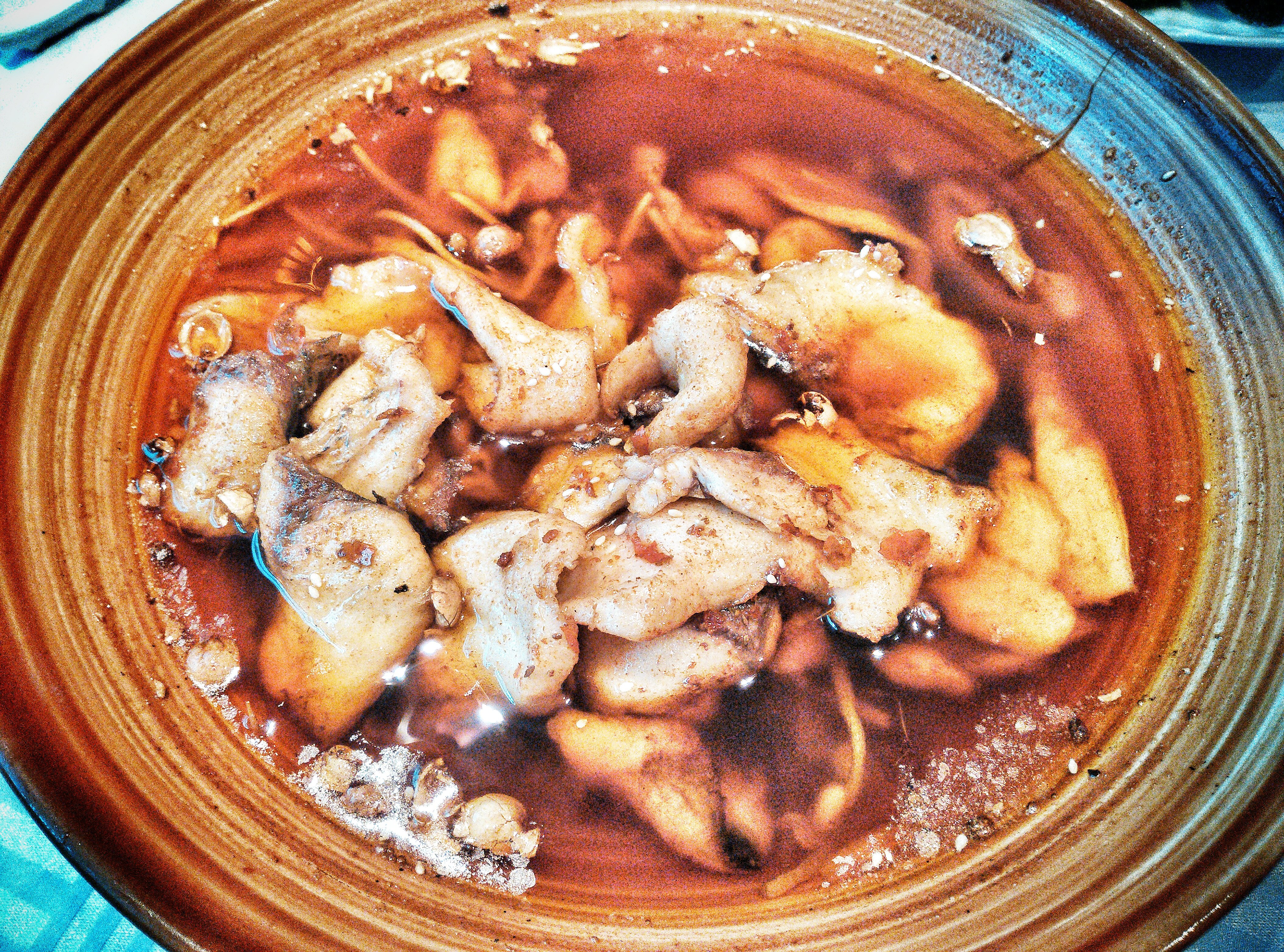 饥寒交迫的时候朋友带路来这。 这个孜香浸鱼味道绝佳,看这像水煮鱼的样子,但是几乎不辣。而且有浓香。 鱼肉鲜美。对于一个很饿的人来说真是人间极品啊。那只烧鸡你们是点不到的,因为是我们自己带的袋装食品。嘘!