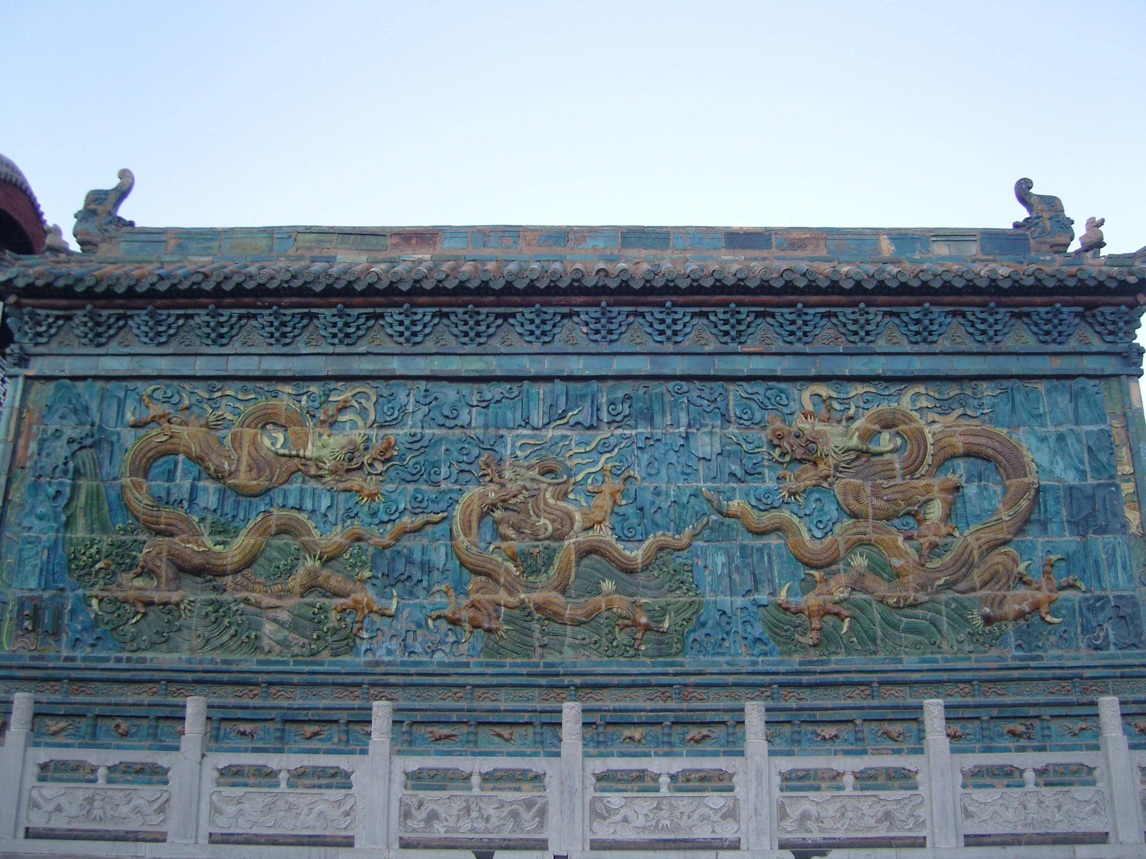 观音堂的三龙壁是大同唯一的一座双面琉璃龙壁,两面都有三条黄色的琉璃巨龙,都遨游在蓝色的天空和青绿色的江涛海浪之中,不同的是北面的龙壁镶有龙珠,南面的却没有。 我下车的时候,下午的暖阳正歇歇的晒在南面的龙壁上,黄、蓝、绿的琉璃瓦在阳光下反射着斑斓的色泽,原本静态的龙似乎有了腾飞的韵味,好像随时间都将奋出海,游弋于晴空碧海之间。