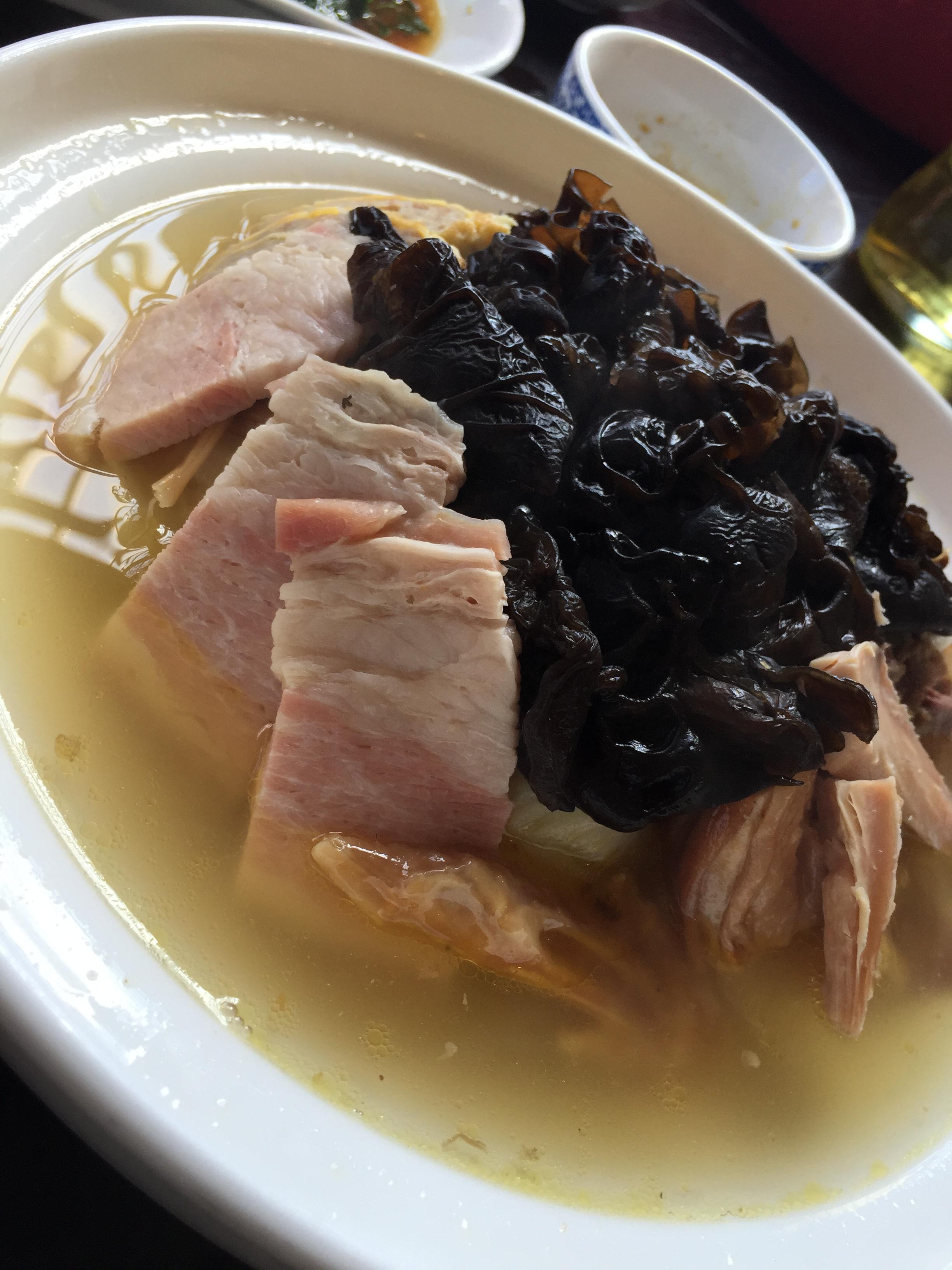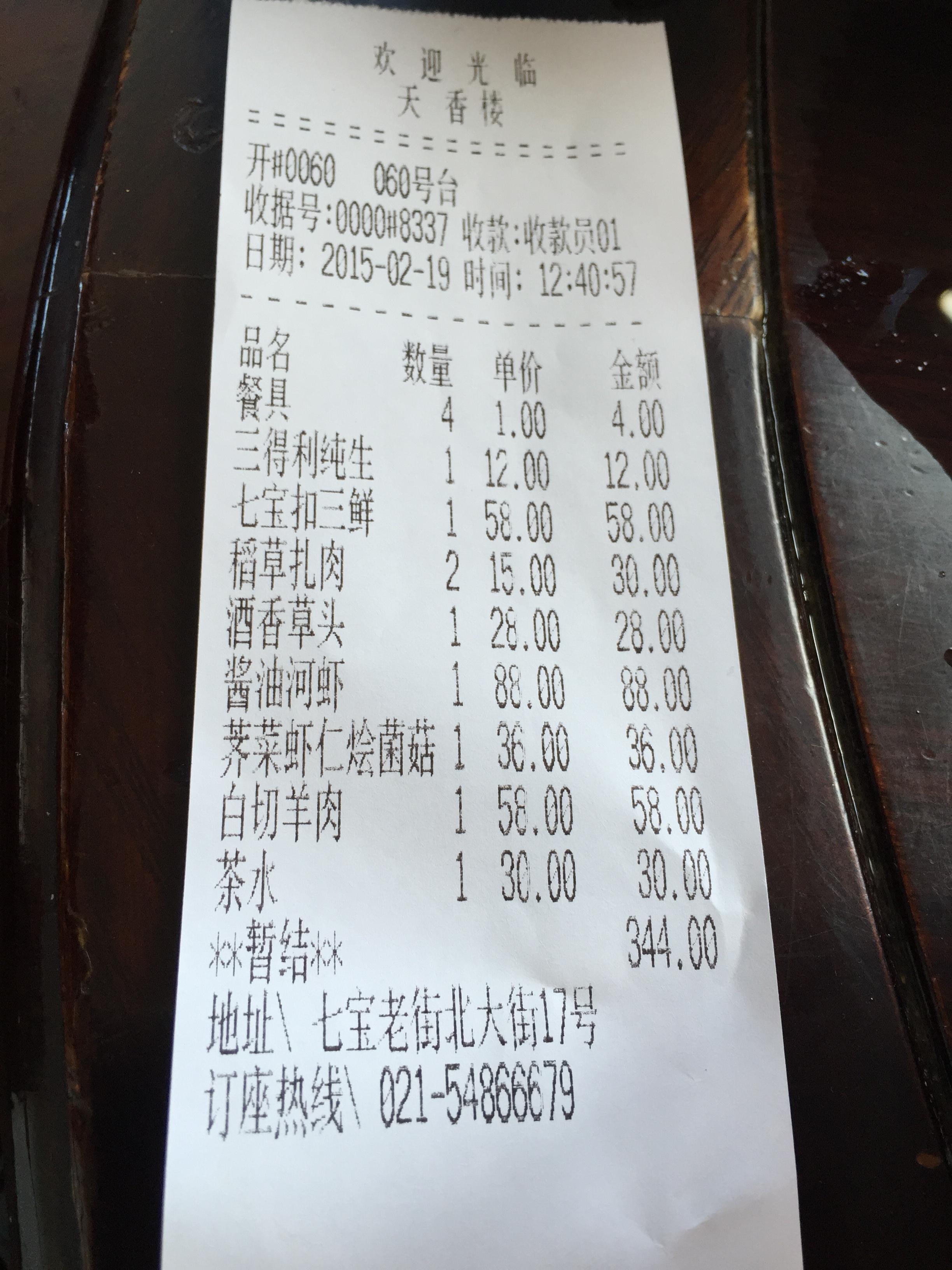 带着爸妈和男朋友一起到七宝古镇游玩,中午挑选了这家老字号吃饭,被带到一个类似包房的隔间里用餐,环境很不错,外面可以看风景,隔间里也比较安静。点了扎肉、草头、扣三鲜、河虾、白切羊肉、荠菜虾肉烩菌菇,都是很特色的菜,总体来说量大味美价格不贵。最喜欢河虾,很入味,很好吃。爸爸和男友喜欢白切羊肉,很美味的说!酒香草头很嫩,很不错!一顿饭吃掉300多,很实惠很满意哦~~~