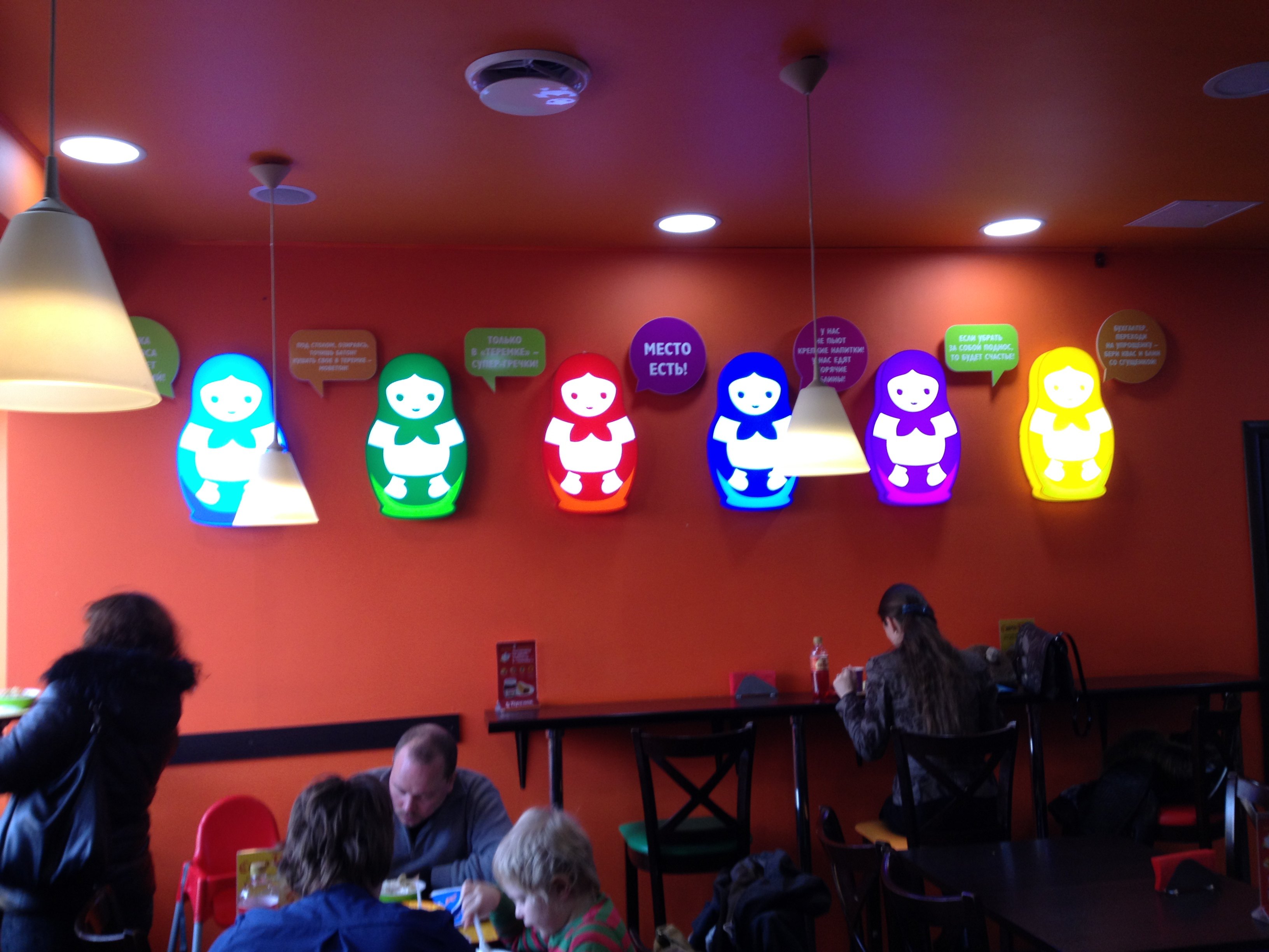 俄罗斯著名的薄煎饼店,在市内各地不仅有店面,还有小吃摊位,可买了带走。是那种类似国内真功夫一样的俄式快餐店,主营俄式薄饼套餐。薄饼的种类真的非常多!芝士蛋、培根、菌菇、甚至还有像可丽饼一样的甜的薄饼,里面有巧克力冰淇淋夹心。 该店还常常推出新品和应季口味,一份套餐里同时还有汤品、色拉、荞麦和薏米炒饭等,也可单点。物美价廉,一份套餐大约在200-300卢布,也就和国内花20,30块钱吃一顿肯德基差不多。