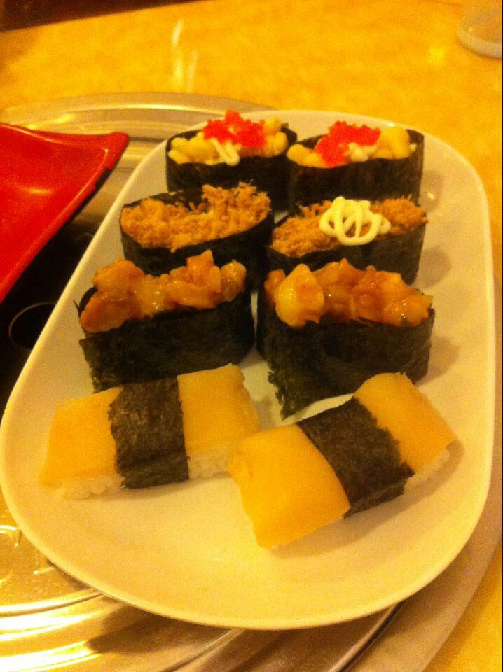 团购的寿司拼盘一人餐,份量很足,我一个吃完还挺费劲的,味道也还行。