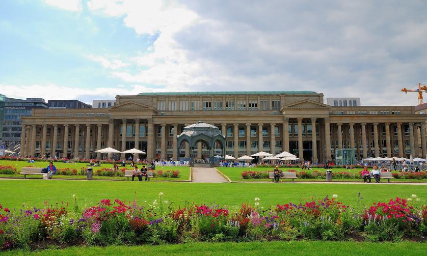 网友2015-05-03广场的东面是新宫殿,南面是老宫殿,西面是国王官邸。斯图加特的市中心广场斯图加特的市中心广场。出了火车站沿着国王大道走500米就可以见到修剪整齐的草坪圆型广场。广场中央是树立着国王威廉姆一世的雕像的圆柱,两侧有喷泉。广场的东面是新宫殿,南面是老宫殿,西面是国王官邸