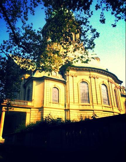 教堂顶端是一个绿色的穹顶,这座新巴洛克风格的教堂形状非常独特,其高度比水塔还要高5米。