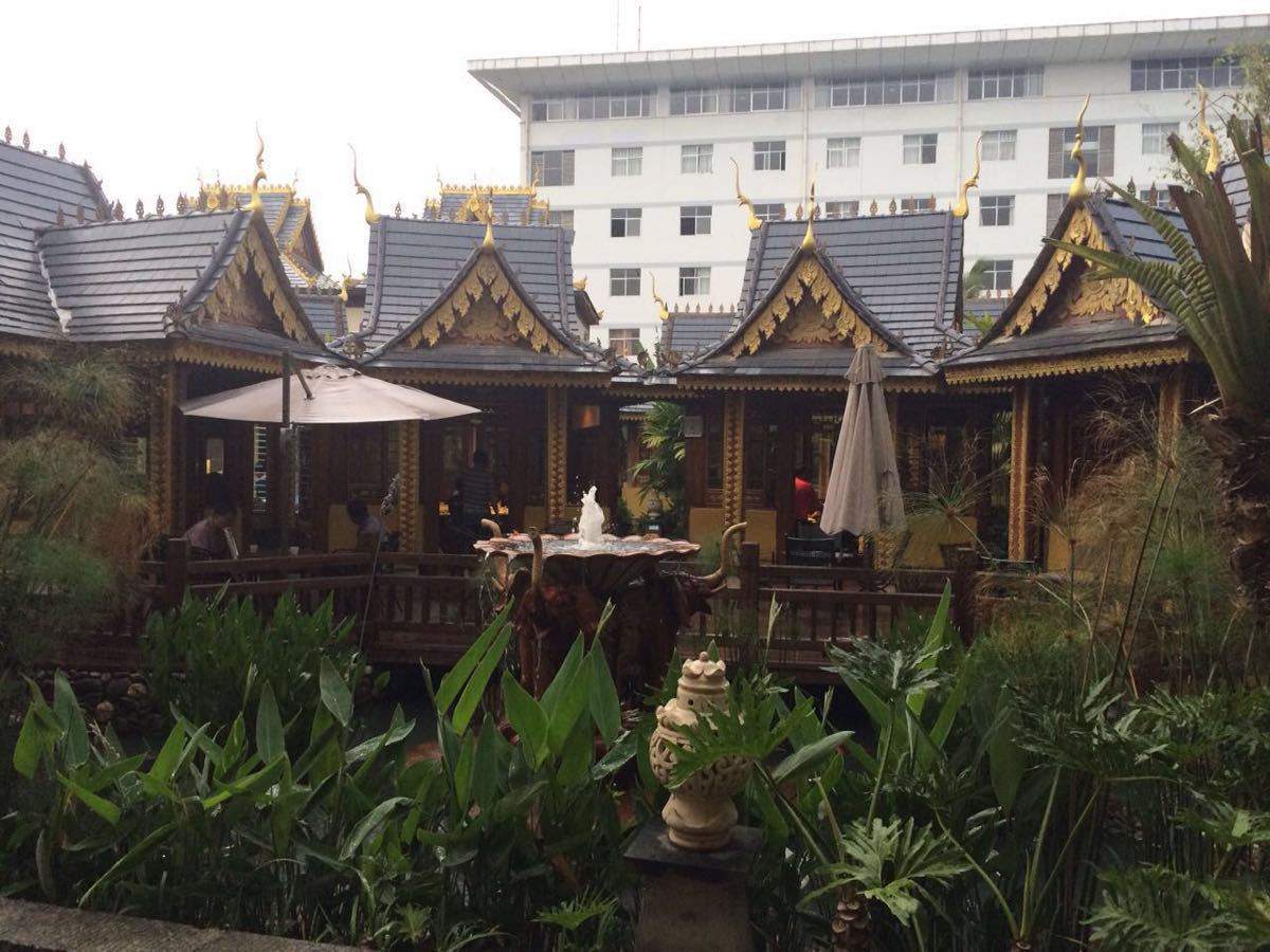 餐厅的建筑很有特色,完全傣族风格的,就是五月在开放的地方吃饭已经开始有蚊子了餐厅的建筑很有特色,完全傣族风格的,就是五月在开放的地方吃饭已经开始有蚊子了。园子设计得不错,有水系有亭台楼阁还有摇椅,养了两对孔雀……服务不错,就是菜有点咸了