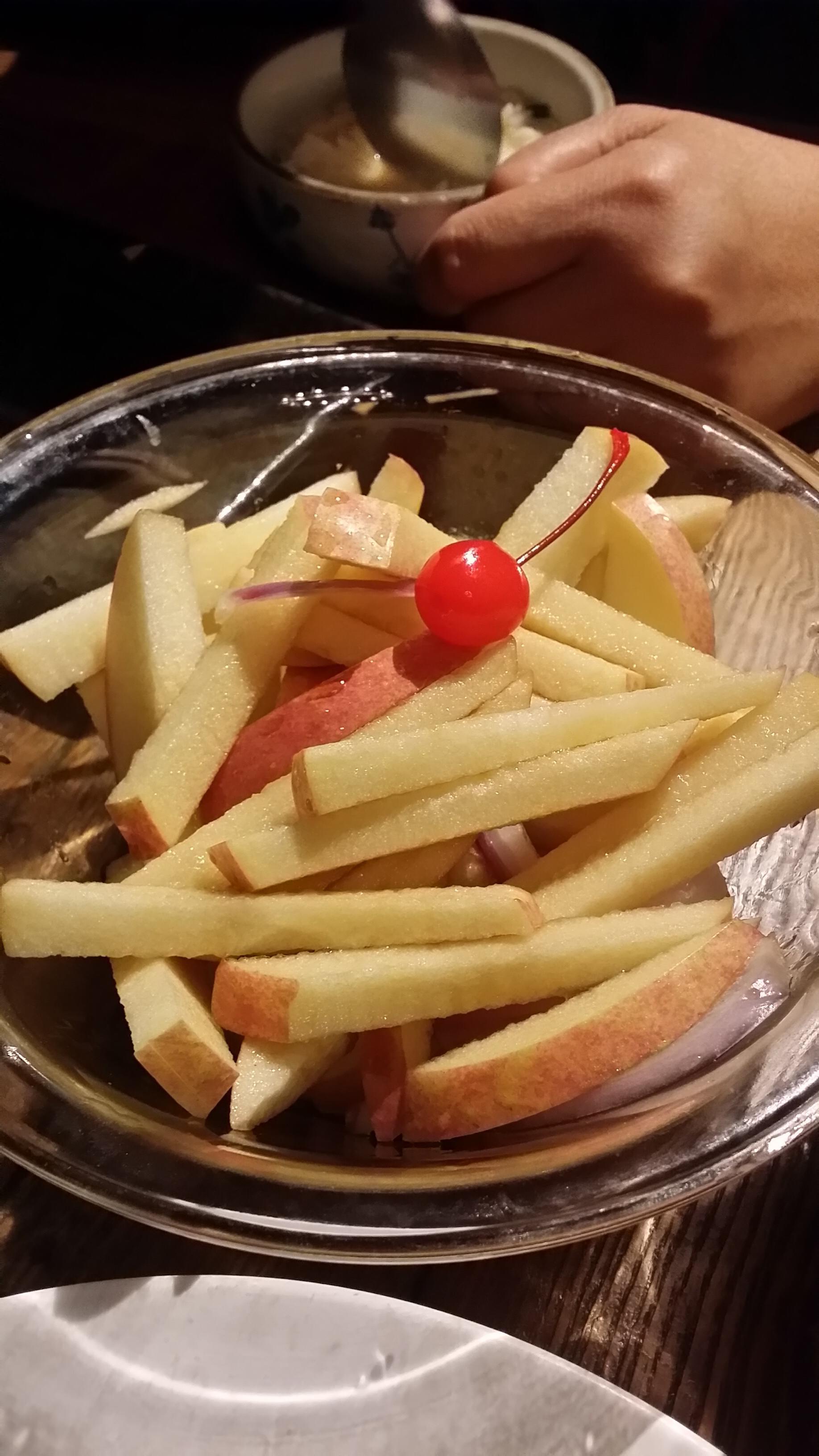 你是我的小苹果,其实就是苹果不去皮,切成条状,再加了些洋葱丝,融合了苹果醋的酸酸甜甜的味道。