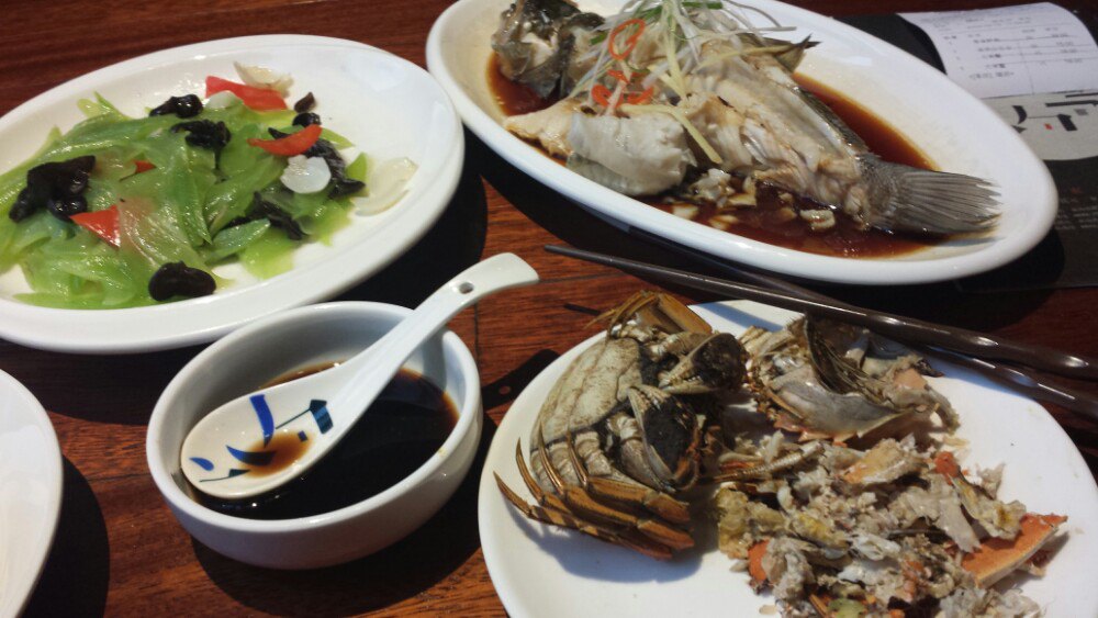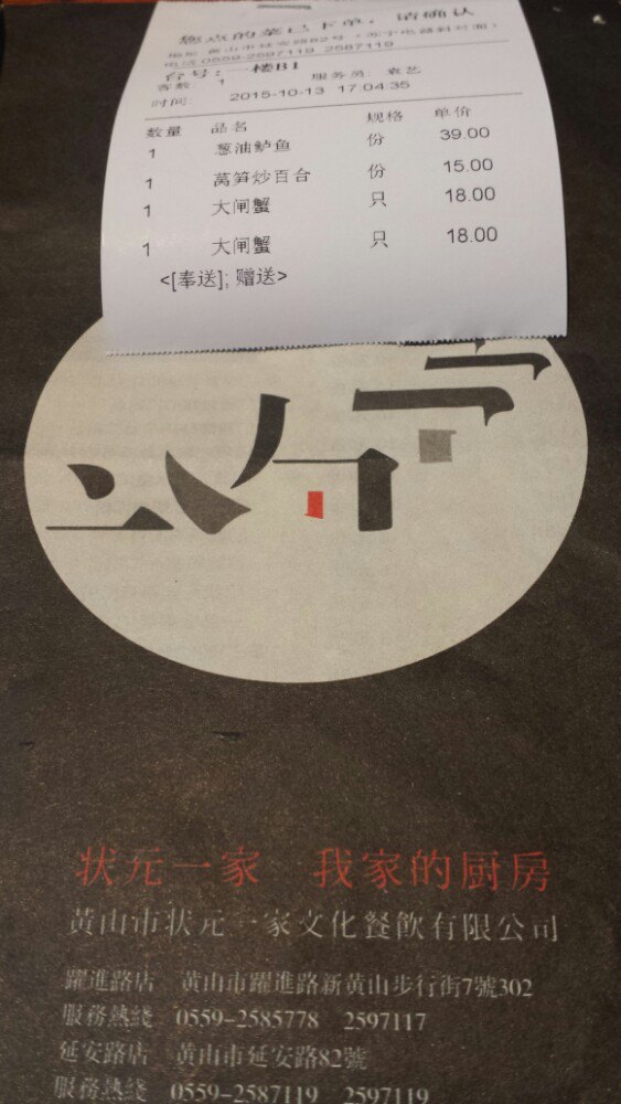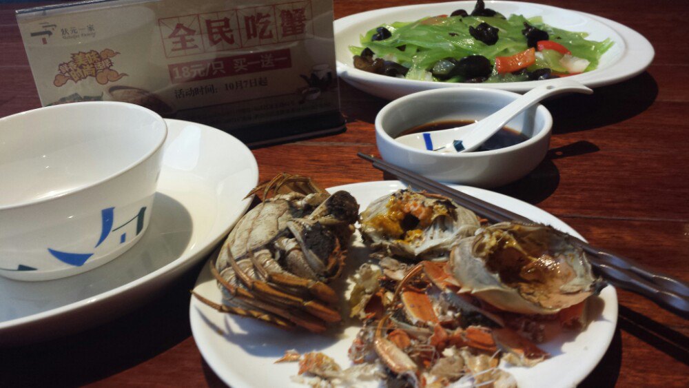 状元一家,徽州菜,众多的特色菜都是以辣为主,麻辣为辅。而且还是把原料提前用各种佐料腌制好的。想吃不辣都不行了。只好点炒菜了。嘱咐不要辣的,店里的服务员大多不太年轻了,但工作效率,态度,服务值得一赞。菜品的看相,搭配,火候还都不错。价钱也公道。近期还有全民吃闸蟹的活动,18元RMB买一送一活动。正值蟹肥时怎能不吃哦。