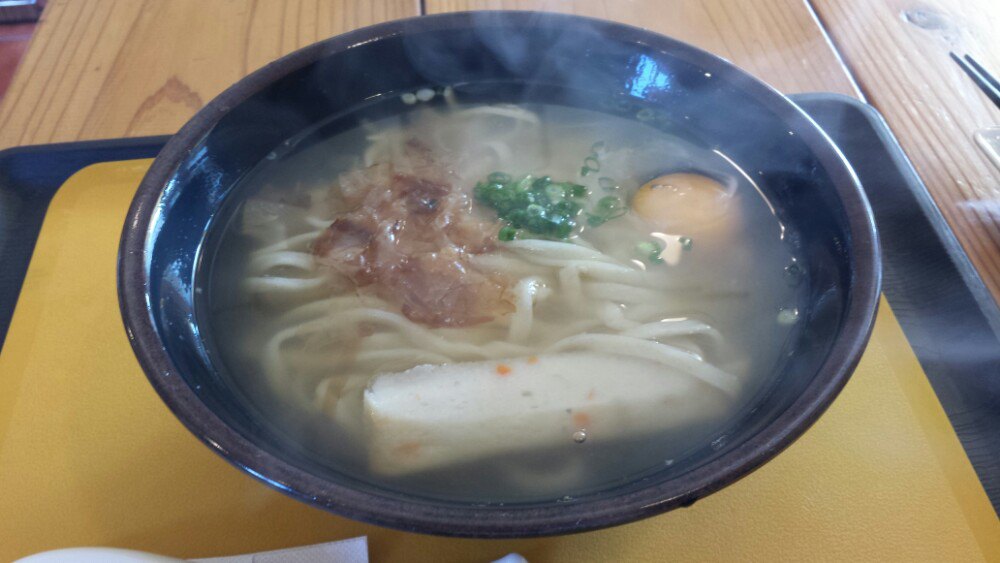 冲绳面比一般拉面要粗要有嚼头,我觉得汤头很好喝,但是,他们打了个生鸡蛋在汤里,搅开后我嫌腥气。
