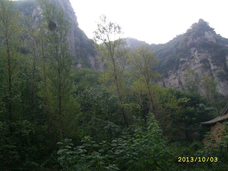 相对于名山大川,五龙洞自有她的宁静与清秀,她的满山青翠和层层叠石,尤其是天生天桥,惊叹鬼斧神功、天造地设,让人留恋忘返。  上山的道路刚开始是漫石铺就,有小亭休憩,路边绿树掩映,远眺风光迷人,绝壁耸立,沟壑纵横。待穿过了五龙洞,石阶徒然变窄变徒,人需谨慎前行。五龙洞光线有些暗,估计刚开发时间不长还未修葺,洞顶有一圆孔微微有天光洒落。待行走在半山腰的石阶上,汗水自然洒落,有几分紧张又有几分兴奋。所谓观景不行,行则不观景正在此体现。所以不妨停下来休息时再远眺风景。待峰回路转,向下行的时候,路况好了许多,走的自然轻松。 路旁有怪石临空突兀,象鳄鱼,象蘑菇伞盖。远方有簇簇柱石林立,名日: 五百罗汉。逾行逾下,到达天生桥,亿万年来的演化,让大自然的神奇展现的人们的视野中,不妨驻足观赏,仔细玩味。逐渐进入峡谷中行进,清凉之 气渐渐袭来,不过可轻松前行,一路直通谷底,到达来时的平台处。