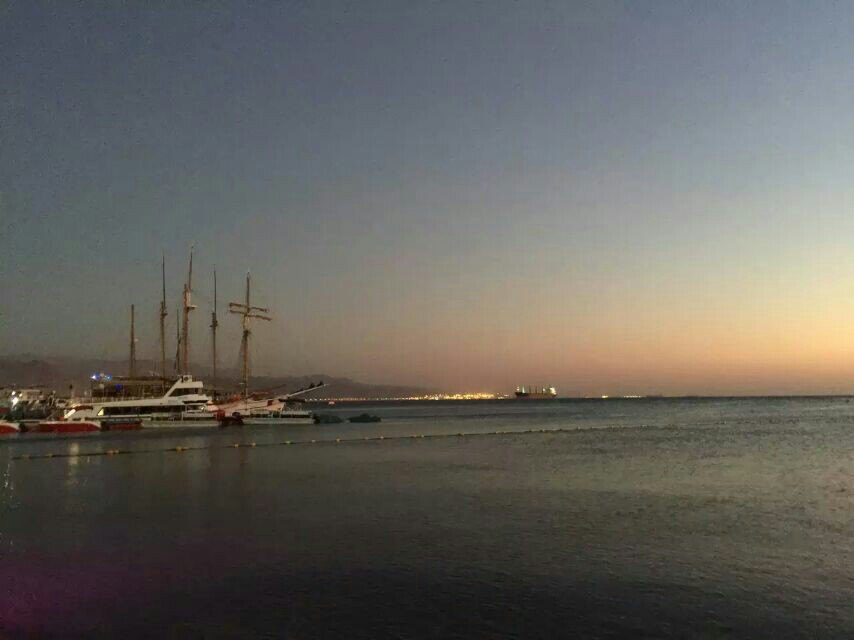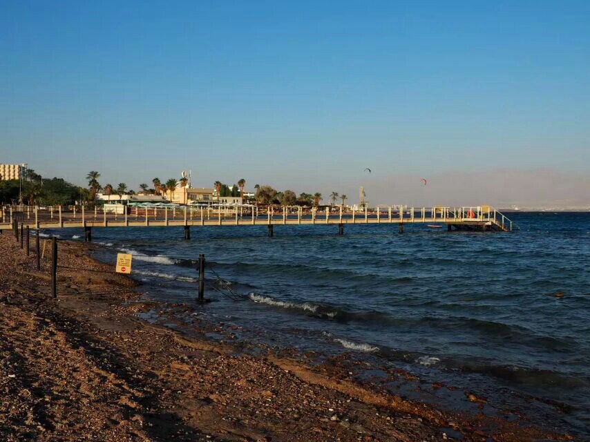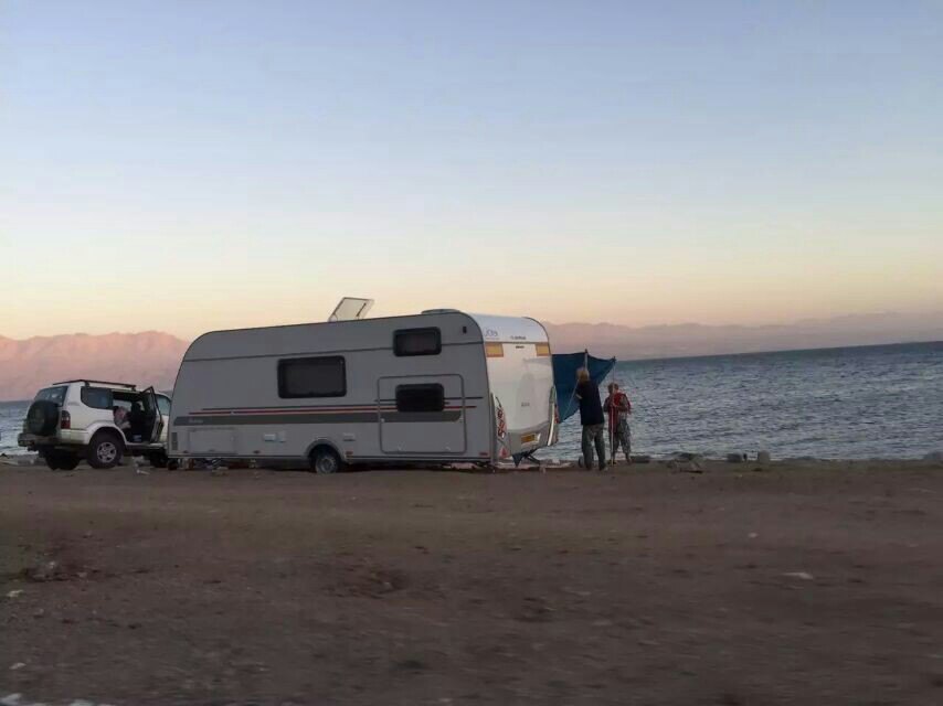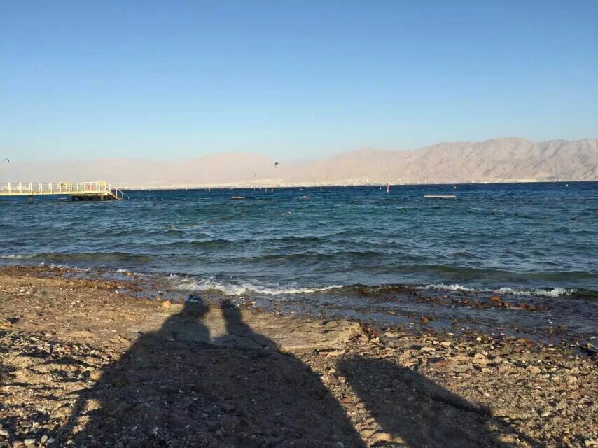 埃拉特红海边,眼前看到的是湛蓝湛蓝的海水衬着远处红色的山。下午四点不到,整个海滩几乎又只剩我们两个人坐在那看海了。离开海滩,沿90号公路继续南行5公里就到了埃及边境了。一路看到很多房车扎营在海边,喝着啤酒,看着美景,很是惬意啊! 喜欢太阳落山后,天际线的那末亮色。 另外,埃拉特是一个自由港,是不错的购物地点。