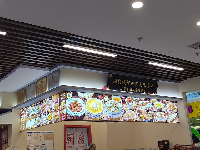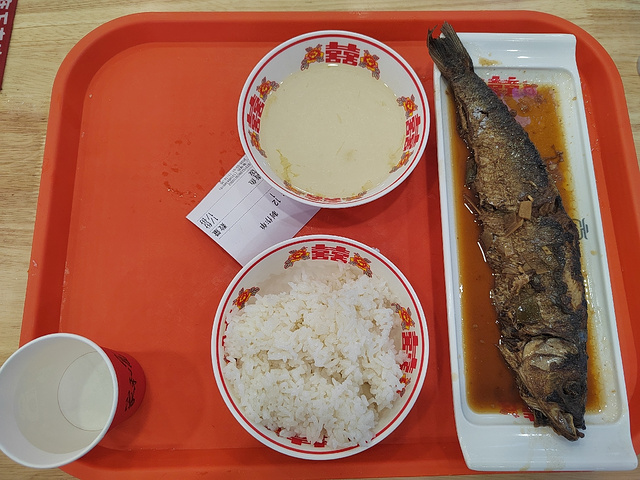 这家店位于大润发一楼。店内面积比较大。这家店是连锁店,在中街还有另一家分店。中午的时候店内的客人还不太多。看图片|青鱼^不错,然后点了|青鱼^。结果端上来以后,发现|青鱼^的颜色好深呐。感觉不是很新鲜。米饭的颜色也不太好,不像是五常大米。店内是完全自助形式,自己到前台取餐。价格不太贵,有免费的|酸菜^汤。