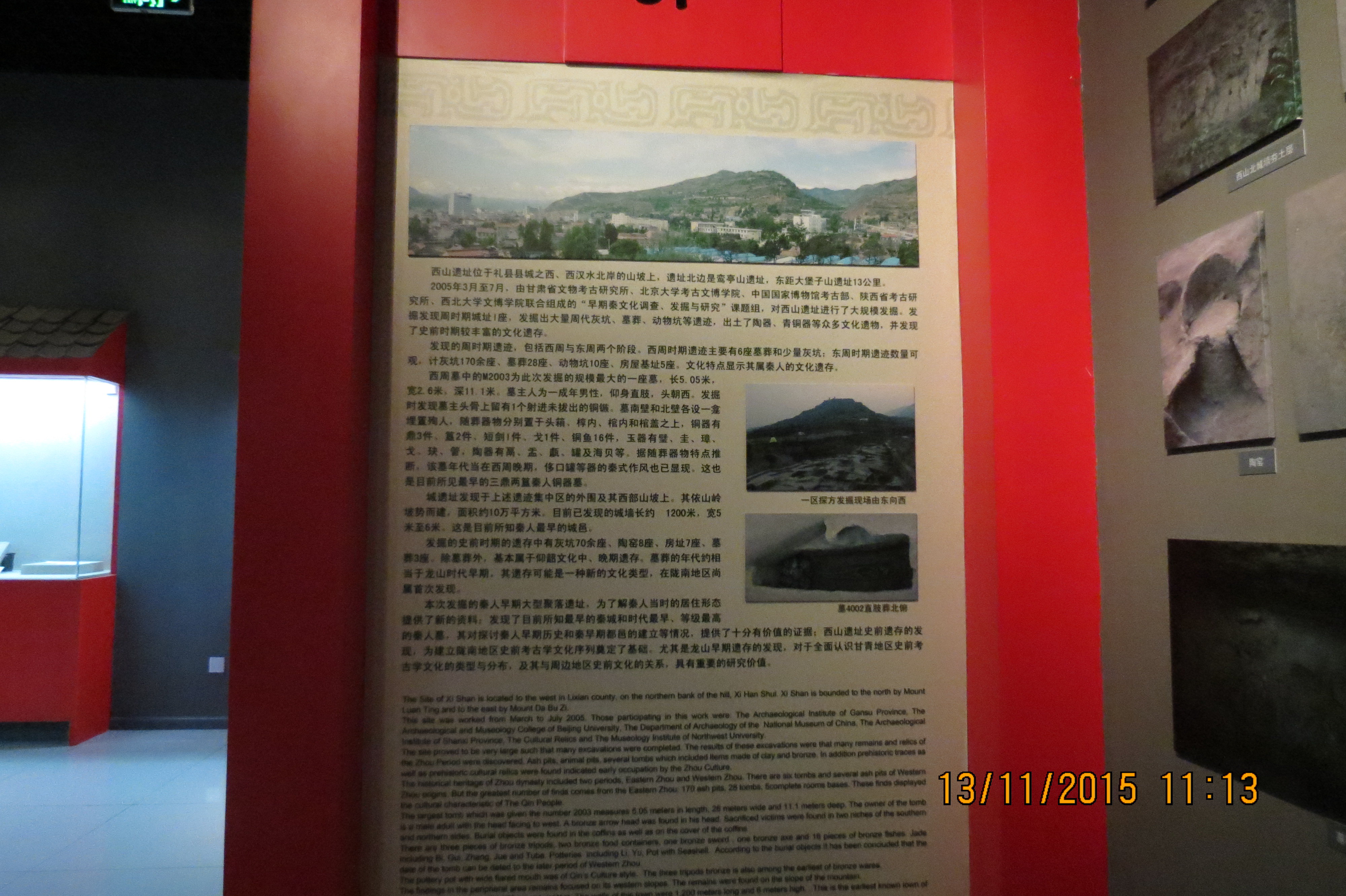 從天水搭大巴到礼县,100公里左右的行程,一路走走停停的走了3.5小時,下車走10分鐘,到甘肅秦文化博物館,天啊 休館! 跑了近千里而來心有不甘,幸好碰上好心的工作人員讓我進去參觀,十分感謝. 此處主要以秦人发祥地及西垂陵园為主題,以大堡子山遗址及圓頂山遗址出土物為展覽重心,可惜經過盜掘,出土文物甚少,史書上對這段歷史又記載不足,館藏不是很豐富,不足一小時就參觀完,出來後搭出租車到大堡子山遗址,路邊下車延坡間小路爬5分鐘左右,看到一片荒煙蔓草之地,一個大棚,目的地到了.整處大堡子山遗址雖規劃了,沒有開發,十分可惜,下山後搭大巴,延路載人,但沒有停車等人,回天水約2小時. 本人偏好歷史遺址所以將此處訂為可以一遊處