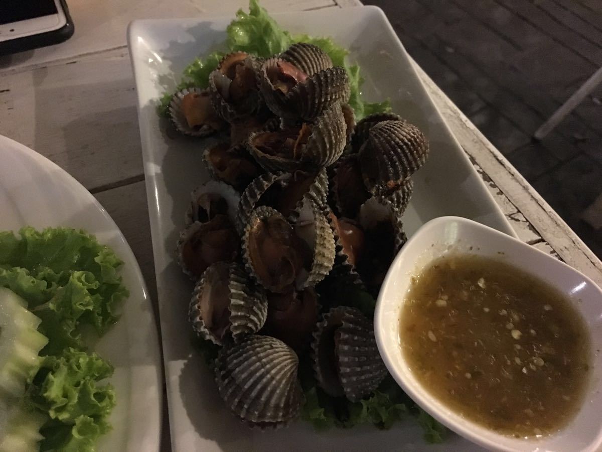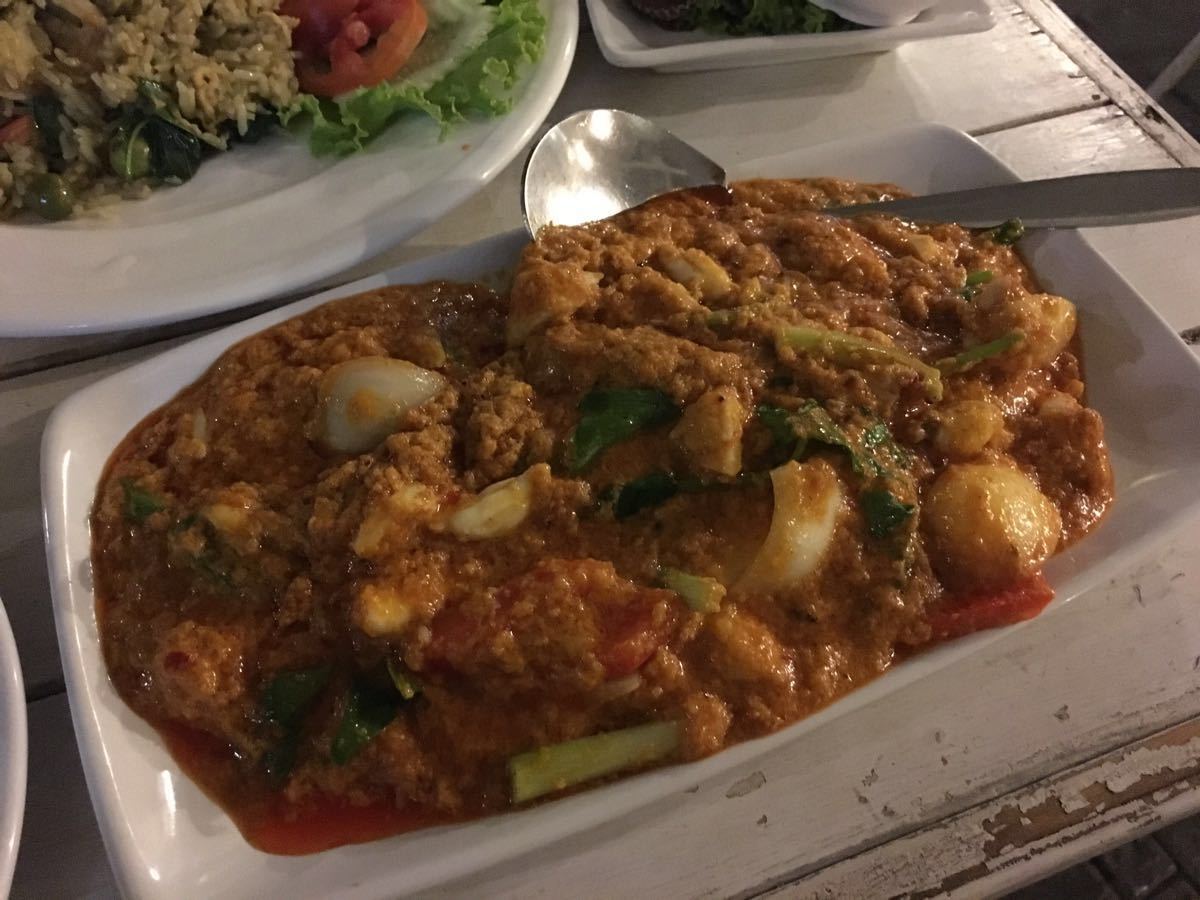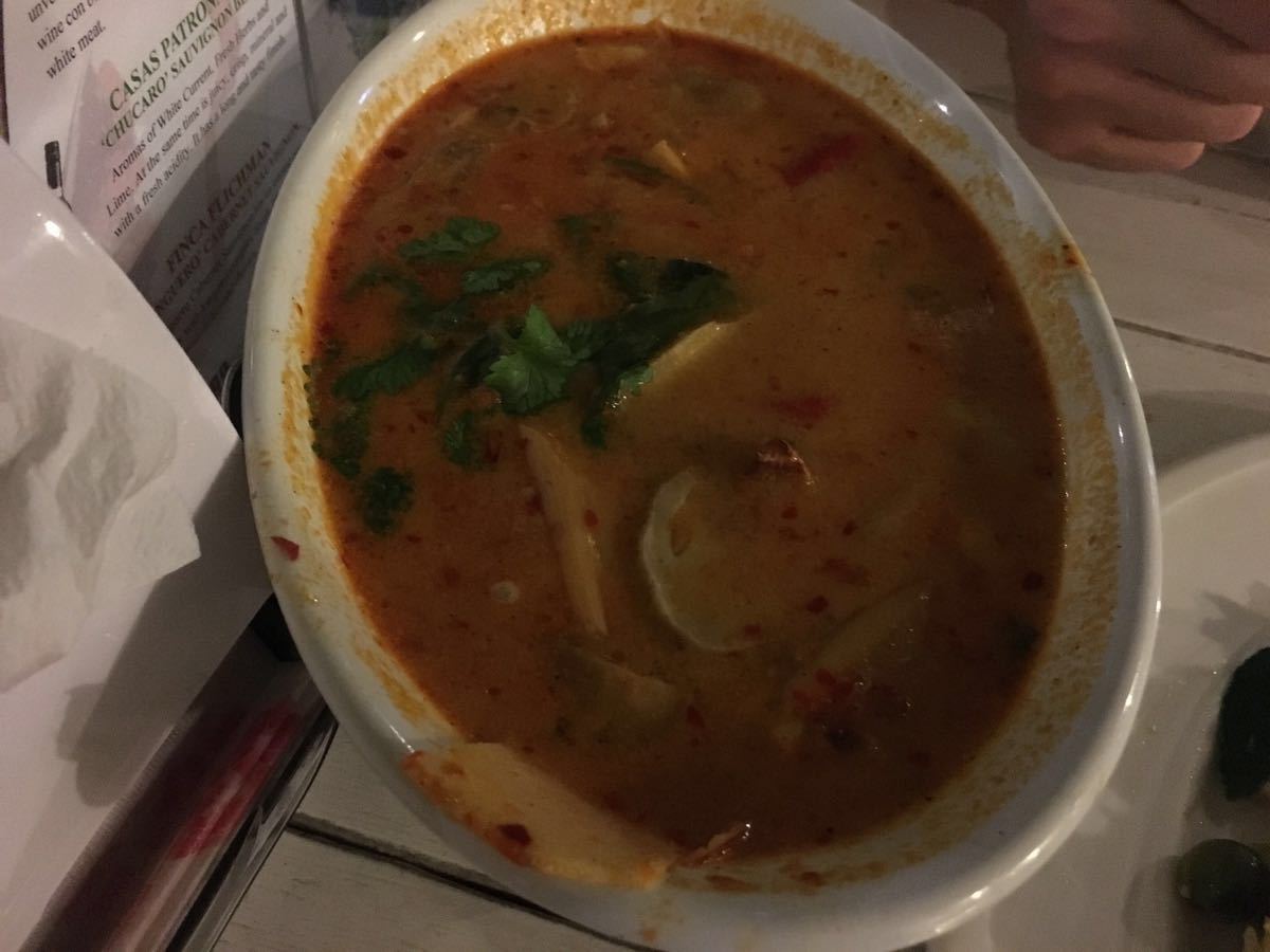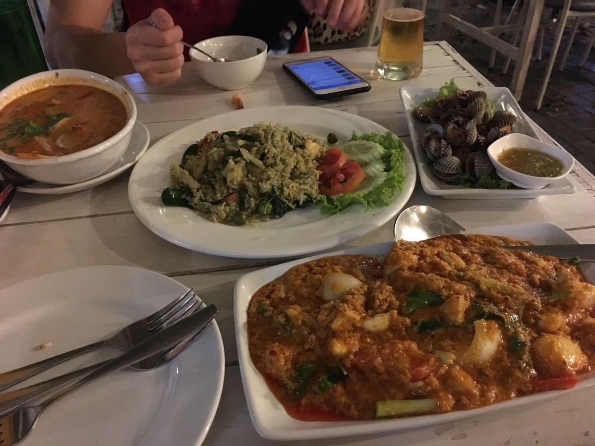 点了四个菜,瞬间刷新对泰国菜的观感~话说国内泰国菜馆真的弱爆了……英语小白读菜单真的很无力,连猜带蒙加翻译,一个蛋炒螃蟹,一个花蛤,一个绿咖喱炒饭,一个米粉炸猪肉,一个冬阴功汤。冬阴功汤是甜辣的~赞赞哒!绿咖喱炒饭也是不能再好吃了!中间来了很多老外,点的菜也让人眼馋,啤酒有点小贵,话说小费到底要怎么给呢?有没有专门培训啊?结账的时候真的略尴尬……