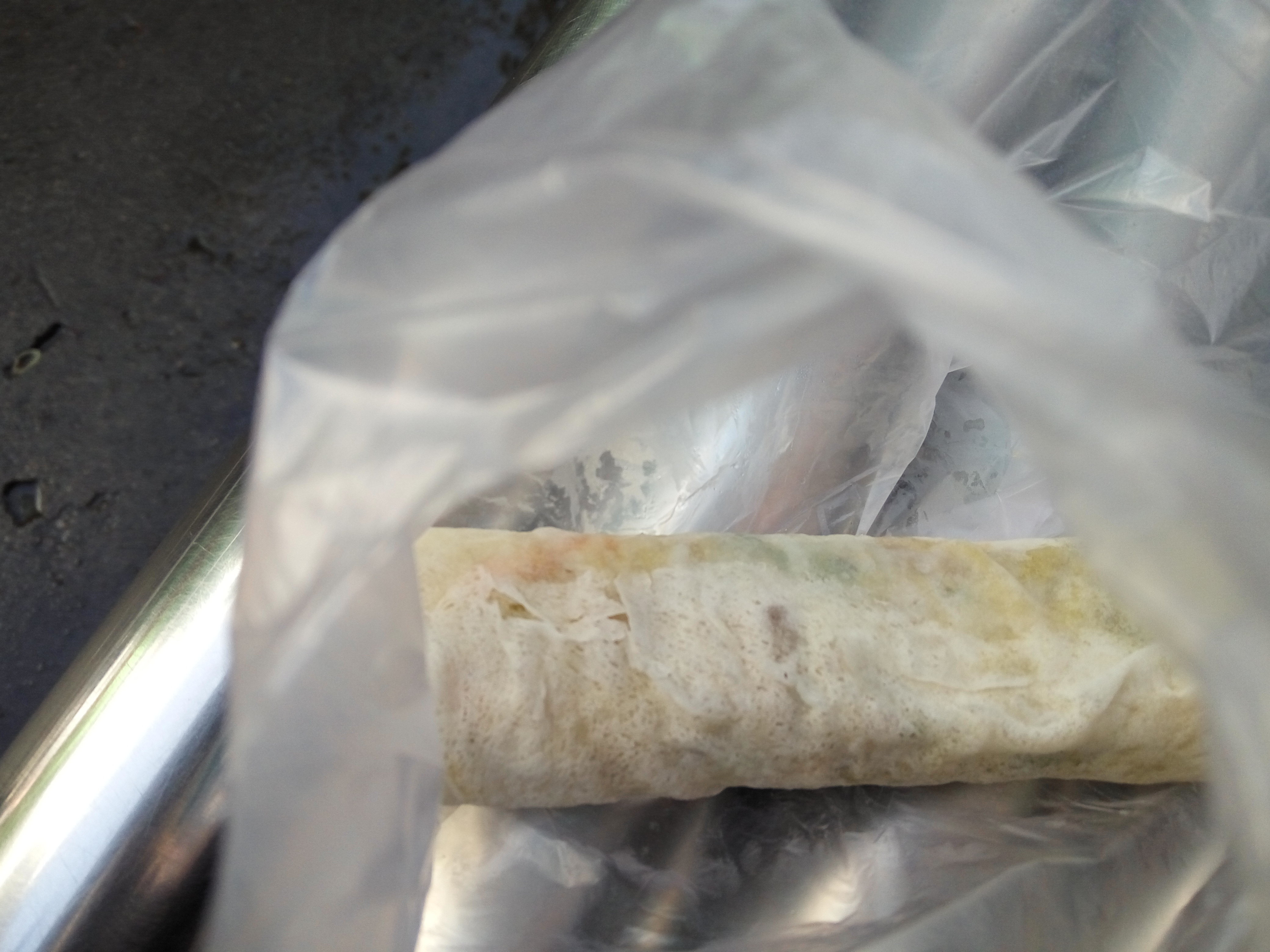 就是三丝春卷啊,外面现做的皮子,里面把菜包上就直接可以吃了,不用油炸,当然如果你喜欢油炸的也可以就是三丝春卷啊,外面现做的皮子,里面把菜包上就直接可以吃了,不用油炸,当然如果你喜欢油炸的也可以。味道一般般,2.5元一只。