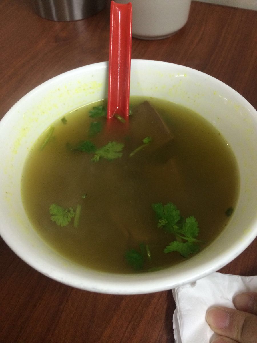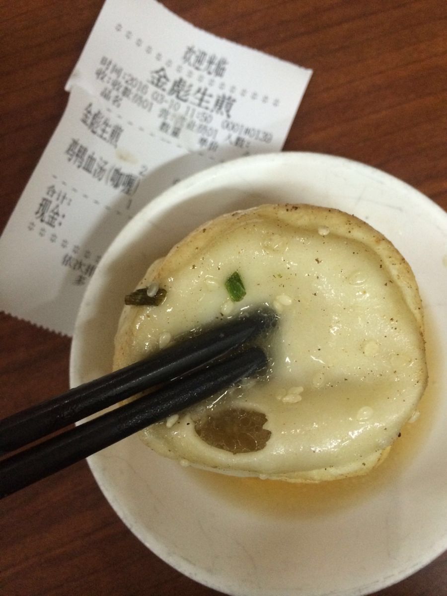 好久好久没来,好吃的蛤蜊小馄饨已经不卖了。因价格亲民,受周边白领青睐,午饭时间总是要拍很久的队。 【鲜肉生煎】卖相依然不错,煎生煎的师傅火候控制的也相当到位,生煎底又厚又酥。只是生煎即不是全发面也不是上海常见的半发面,而是几乎没发的面,因此皮很粘牙。馅心内自然大量的皮冻大量的汤汁。一直不明白为何生煎现在越来越崇尚汤多?更奇怪这类生煎怎么就变成上海生煎的代表了? 【鸭血汤】上桌才发现是咖喱汤的,只想说“店家很创新”。 【总结】随便吃吃还是不错的,毕竟现在工薪族一顿午饭真心不便宜,这里20左右就能管一顿饭。外加大量动迁,这类饮食店能保留已是不易,将来想吃都难。