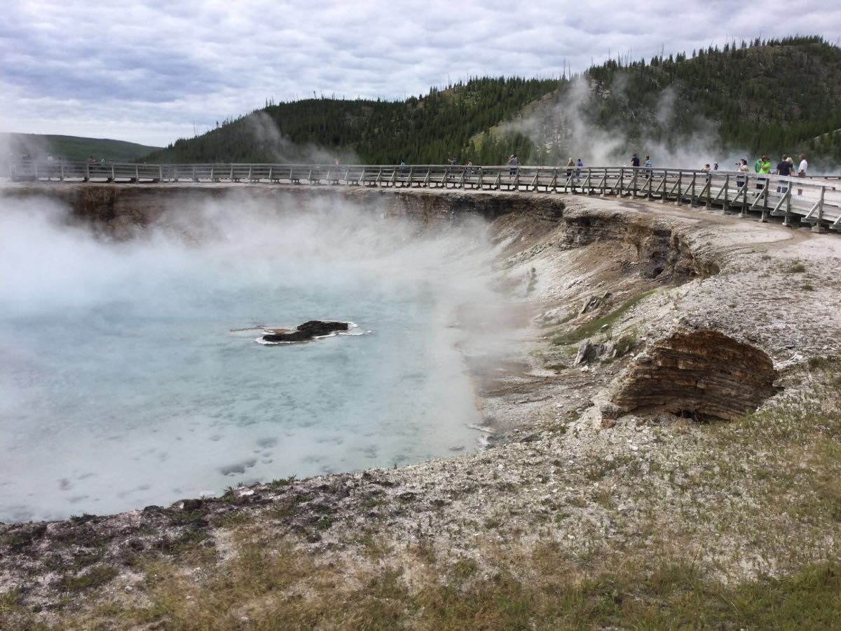 在大棱镜泉旁边,很大一坑。蓝色的泉水不算漂亮,蒸汽很大,透过蒸汽,能看到冒泡泡的泉眼呢。介绍说这个泉水曾经喷发出巨大的水量。已经很久没有喷了。我们去的时候,等了好久,希望遇到奇迹。当然,没有那好运气。