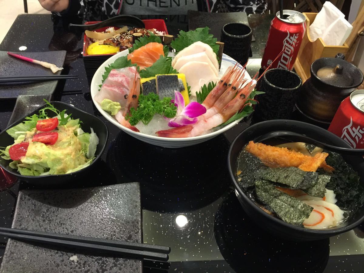 因为女儿在中山西路近环球港的地方上课,等她下课的时候用大众点评搜索到了这家位于环球港二楼的日料。看介绍他家是来自于冲绳,由于美军基地对外关系形成了具有美式风味的日式料理。而且在“点评”是“普陀区人气最高日本菜榜”第5名,另外还有可团购的各种优惠套餐,所以就去了。 去了一问才知道周六、日套餐都不能用(在点评里写在一大串不可用日子的最后面没注意到),这样的话性价比一下就差了好多,再加上小长假的缘故人比较多都没有服务员有空来招呼客人,等了一会儿才有作为,还不是店内的,而是店门外围的几张桌子里的一张。等于就是商场的过道,还是有些吵的。 点了三份饭、面做主食,分别是什锦生鱼片寿司饭、鳗鱼饭和大虾乌冬面,外加一个刺身拼盘(单加了份希鲮鱼刺身)。总的味道还行。
