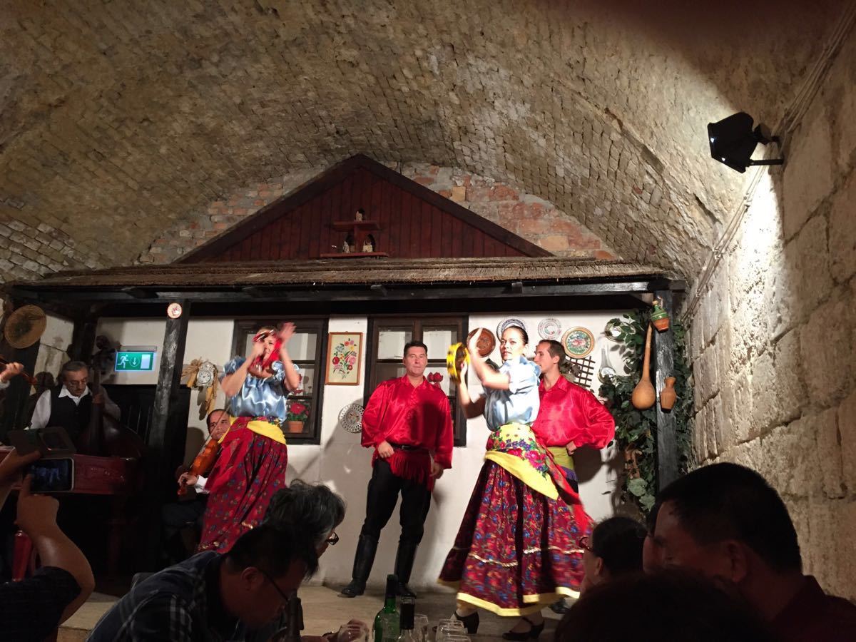 这是个由酒窖改建的歺厅,里面接待旅游团并有匈牙利民族舞蹈表演,菜的口味不是很适合中国人,甜点还好这是个由酒窖改建的歺厅,里面接待旅游团并有匈牙利民族舞蹈表演,菜的口味不是很适合中国人,甜点还好。可以和匈牙利美女合影,然后做成标贴在歺厅卖的葡萄酒瓶上,变成独特的旅游纪念品,价格也不是太贵。