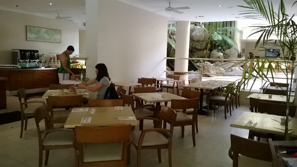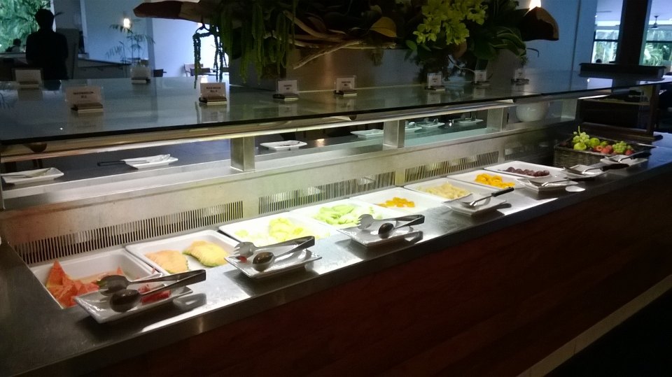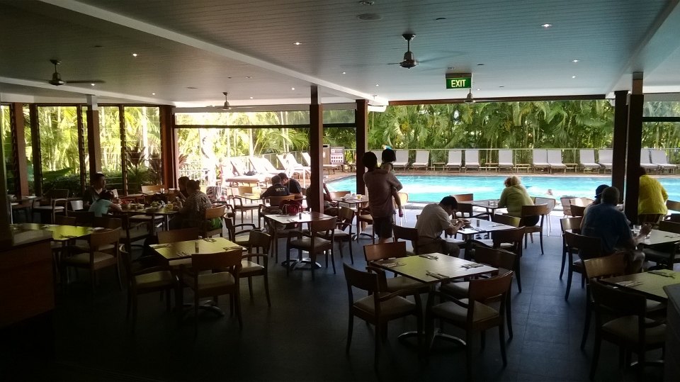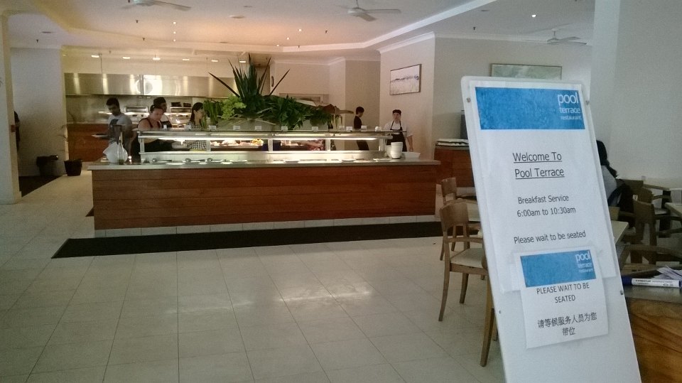 就在珊瑚景酒店楼下,是岛上最具规模的餐厅,自助早餐也是最丰富、开放时间最长的(早上6点到10点半)。餐厅一边是宽敞的大堂,一边是漂亮的泳池,自助取餐台也设了好几个区域,供应多个中西式品种,甚至连中汤、粥面、炒饭也有,而且为方便越来越多前往汉密尔顿岛的中国客人,餐牌上已有中文标示。当然,在这里除非自己掏钱吃海鲜自助晚餐,早餐的菜品价值并不高,也没有Sails Steak and Seafood Grill的那么精致。