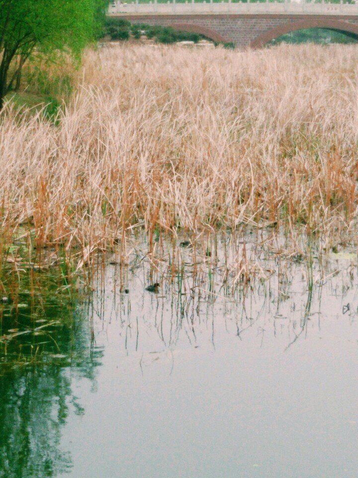 在河边行走,树木掩映,水中野鸭潜起,别有一番感觉