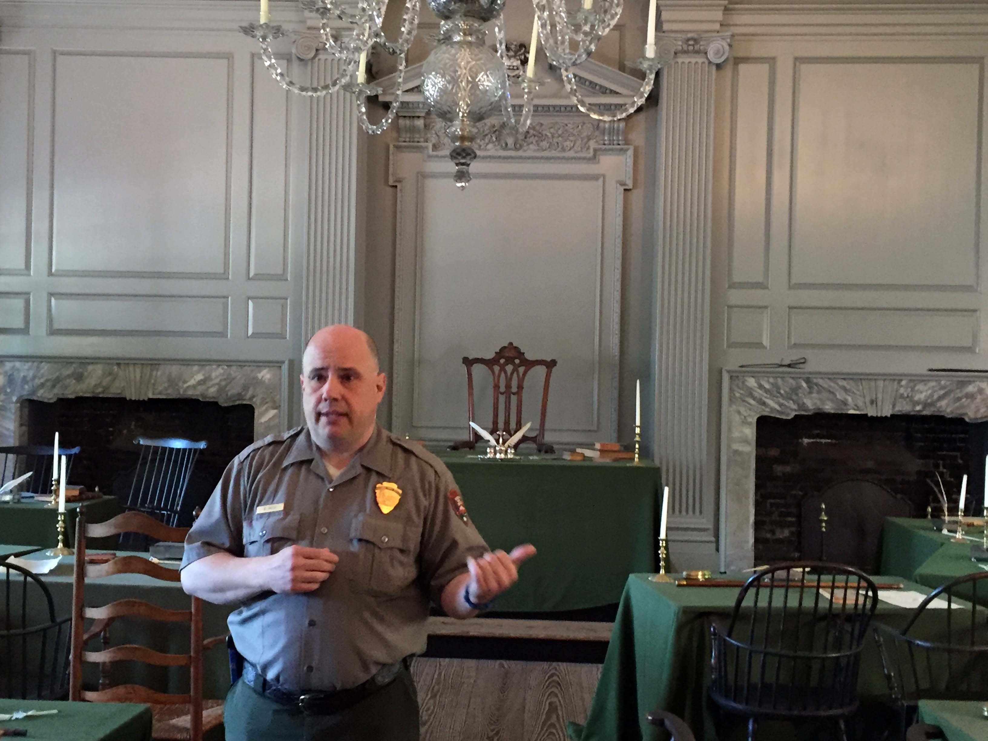 独立宫列入世界遗产,很值得游览,免费,但是需要在游客中心(INDEPENDENCE VISIT CENTER)领取当日参观券或预约。8:15到了独立宫游客中心,大概已有二三十人排队,有工作人员发放旅游资料,小册子里有地铁图,很有用。8:30开始进入室内领票。领票不检查护照等证件,可以领取当天的票或预约非当天的票,每人可以领取最多十张票。我们要了当天九点的票。 独立宫离开领票的地方不远,步行十来分钟就到了。可以先拍照等待入场。参观独立纪念馆时分成小组有人讲解,带领参观。一楼的会议室,当年华盛顿开会的地方,代表坐过的桌子、椅子保持原状展现在观众眼前,华盛顿座椅的靠背上方是一轮冉冉升起的太阳。讲解员还专门展示了画板。参观大约半个来小时,讲解人员英语说的很快,加之涉及很多背景,不易听懂。