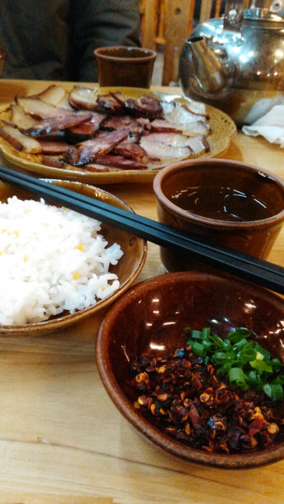 没有尝试长桌宴,点了炒菜,苗家三包,土鸡汤,蕨菜,味道都很好,腊肉趁热吃特别香.店内的都是木制的颜色,显得很古朴,还有些绣花农作物的内饰,也挺用心思.门口穿苗服的姑娘和吹笙的小伙儿也卖力的招揽客人.位置就在表演场旁边也很好找.