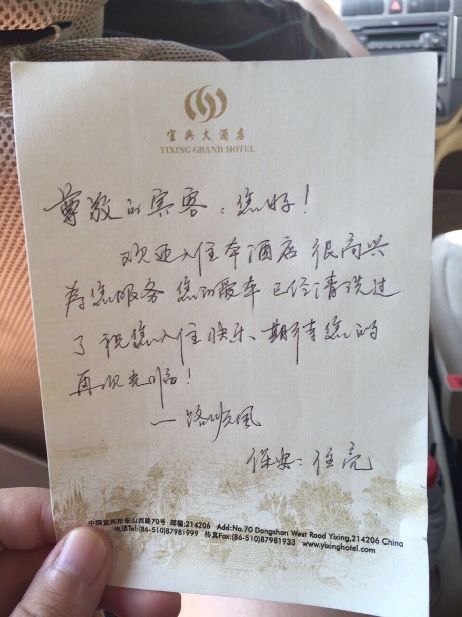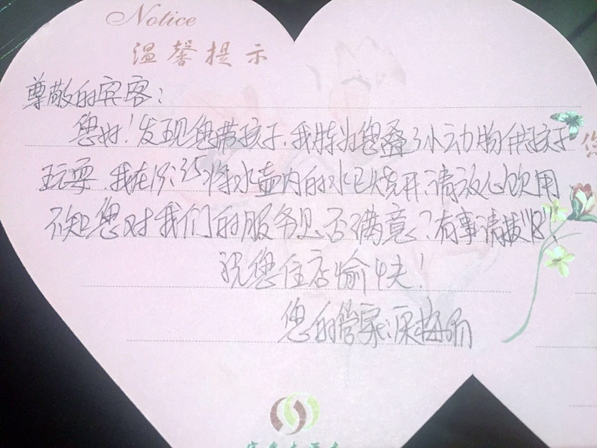这酒店真是让人感动得要哭了,下午到店还没下车小哥就抢着把行李全都接过去了,前台刚送上冰镇酸梅汤和给小朋友的礼物,经理就过来热情洋溢地介绍周边景点路线,送上萌萌哒的手绘地图,还和小哥两个人一起把我们送入房间,紧接着就有人贴心地送上儿童用品,这还不算什么,5点多全家出门去吃晚饭,也就不到3小时的功夫,回来发现这个才刚入住没多久的房间又被整理一新,服务员还留了一张如此温馨的小条.....第二天出门,保安还把我们的车擦得干干净净的,这儿不是什么热门旅游城市,酒店也不是什么跨国连锁巨头,却能坚持如此诚意满满的服务,必须手动点赞!