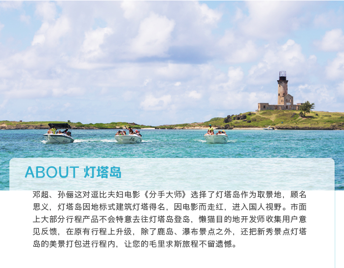 很多人可能去灯塔岛是因为邓超的分手大师,要不就是去鹿岛的时候顺带去的,我到毛里求斯,是 特地去的灯塔岛。因为是自由行,行程自己安排的,我就想着,去了毛里求斯,一定要去一次灯塔 岛!不过因为毕竟对那边不熟,我在淘宝看了好久,查灯塔岛一日游的那种行程,最终找了懒猫旅 行,买了个鹿岛灯塔岛的一日游,很多行程都不去鹿岛的,懒猫这个线路还可以。 吃完午餐,就去了灯塔岛,远远站在海边,瞭望着灯塔岛,心特别宁静,灯塔,灯在哪里,光明就 在哪里,它代表着一种希望,和爱人一起仰望它,那瞬间,能永恒,虽然我是一个人去的。。