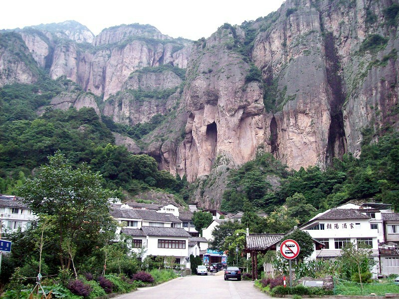 我沿着被山体相夹的异常狭窄陡峭、空无一人的石级往山上走,途中是险峻、突兀的山石风光。当我在山顶上俯视四周的群峰时,却依然不能激起我的游兴,早已见怪不怪了。傍晚我从另一方向下山,沿途有不少更奇特的山岩。晚上我再次到灵峰大门外观看山林剪影,就当作“灵峰夜游”了,要俺买票可没门。