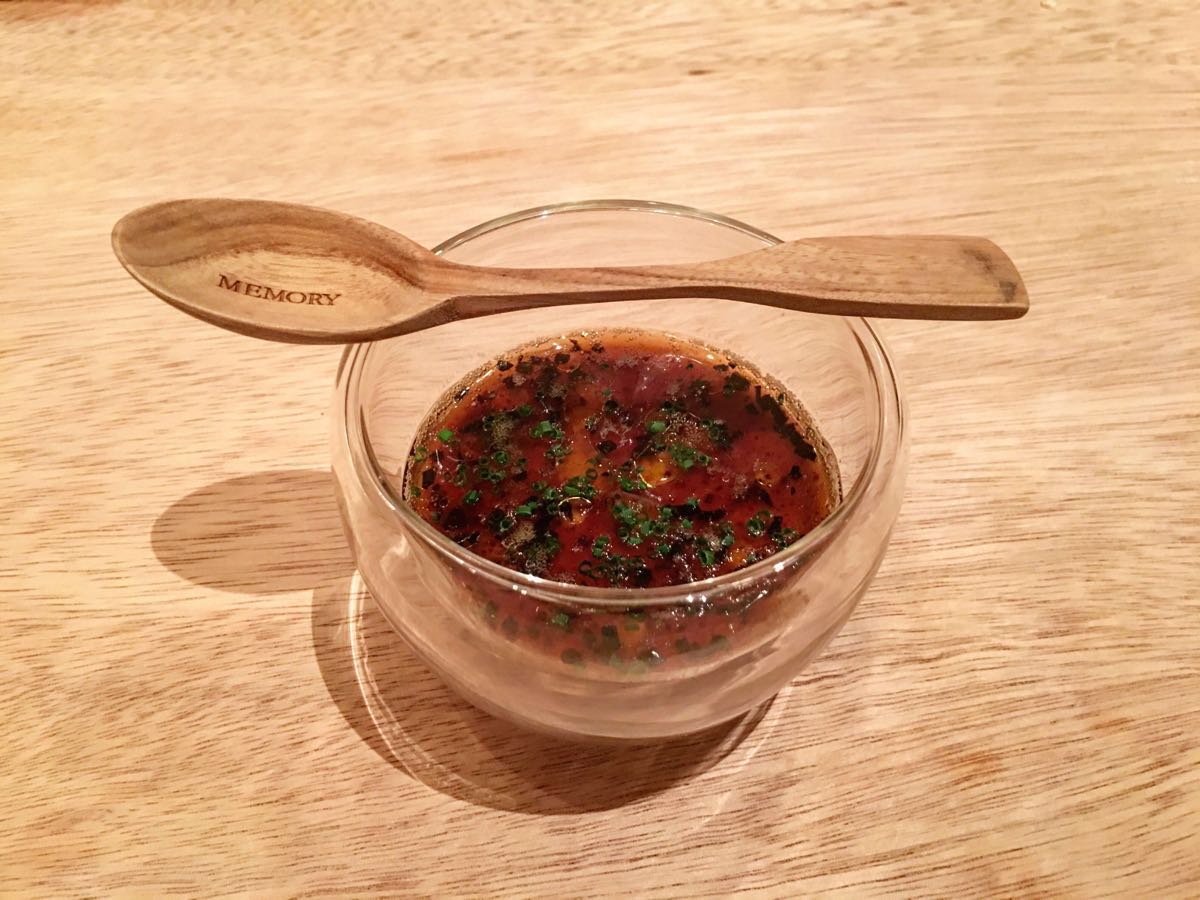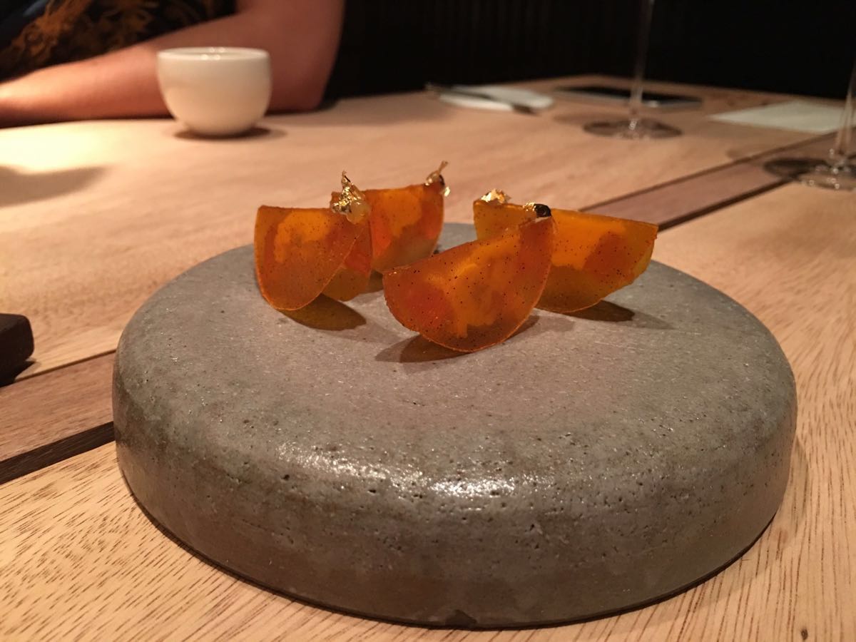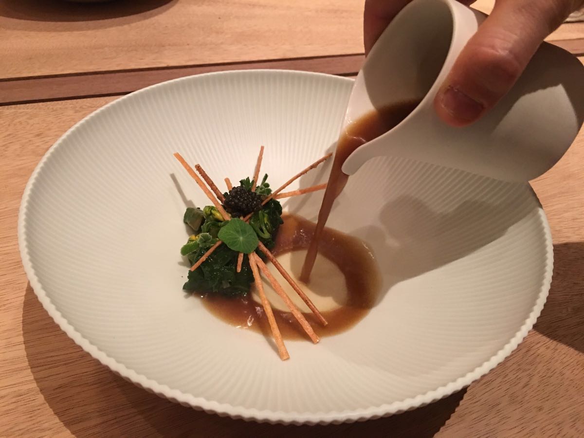 第一次去新加坡,就特意来了这家餐厅!我是提前3天就预定了!餐厅需要交50刀(新加坡币)定金!一进门服务员就非常热情的招待我们!我们被安排在一层用餐,环境非常棒,是现代中西式的装修!桌子一块大的切割木板,与我们一起用餐的一位30多年的木匠,一眼就看出来是比较次的木头,可是柔和的灯光和摆设足以盖过不足!服务我们的是一位年轻,漂亮的姑娘!非常亲切,而且声音非常的甜!主厨的每一道菜都非常精致且融合了中西方的文化!主厨的服务员会非常有耐心的和我们讲解每一道菜的材料和它背后的故事!影响最深刻的是那道鹅肝名字叫“回忆”!用于记念主厨在法国学习时光!主厨把鹅肝做得像奶油的质感上面盖着一场黑松茸!如可即