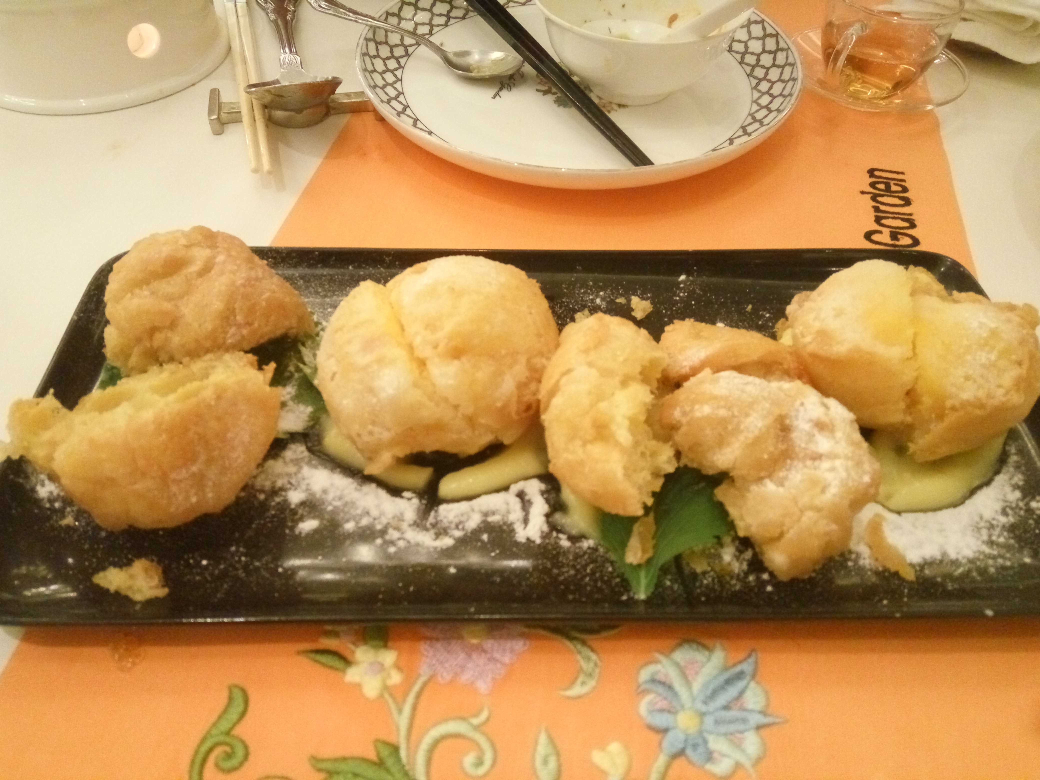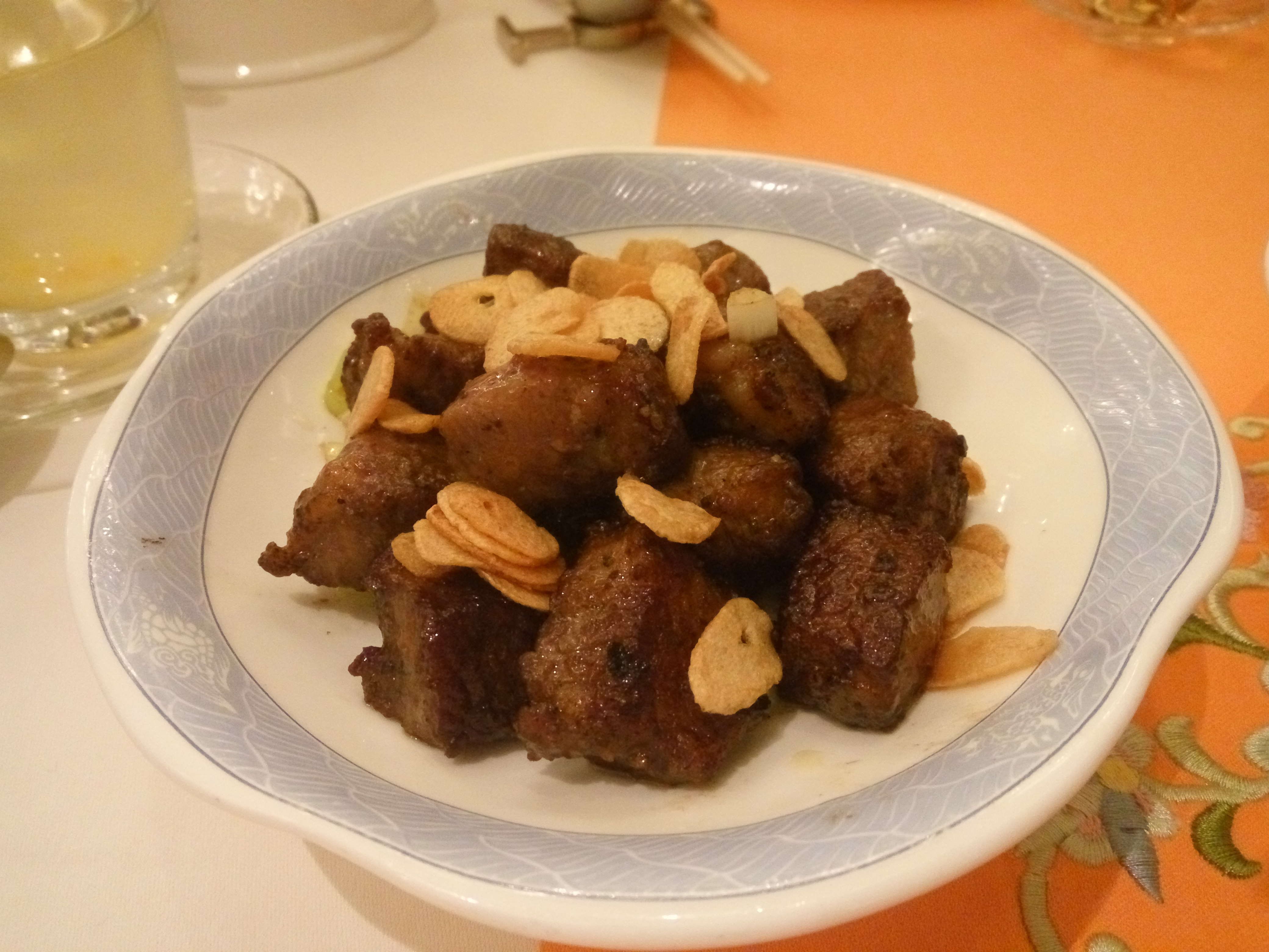 本来想到这里吃点心的,结果说下午点心就卖完了,只能点菜了,不知道是否因为周末生意特别好。话说价格真的不便宜,但是东西的用料还是挺足的,菜量不算大,例盘适合4~6人。最喜欢的是蒜片牛柳粒,牛肉外层略带焦脆里面很嫩,蒜片也是脆脆的。腐衣山淮,是个冷菜,就是花生酱拌山药和腐竹,蛮好吃的。推荐的白雪丁香其实就是鳕鱼蒸银鱼干,第一口觉得蛮好吃,后来就觉得太咸了。甜品价格不算贵,但那个炸雪糕蛋球什么的真不好吃,看着像泡芙入口像冷油条。