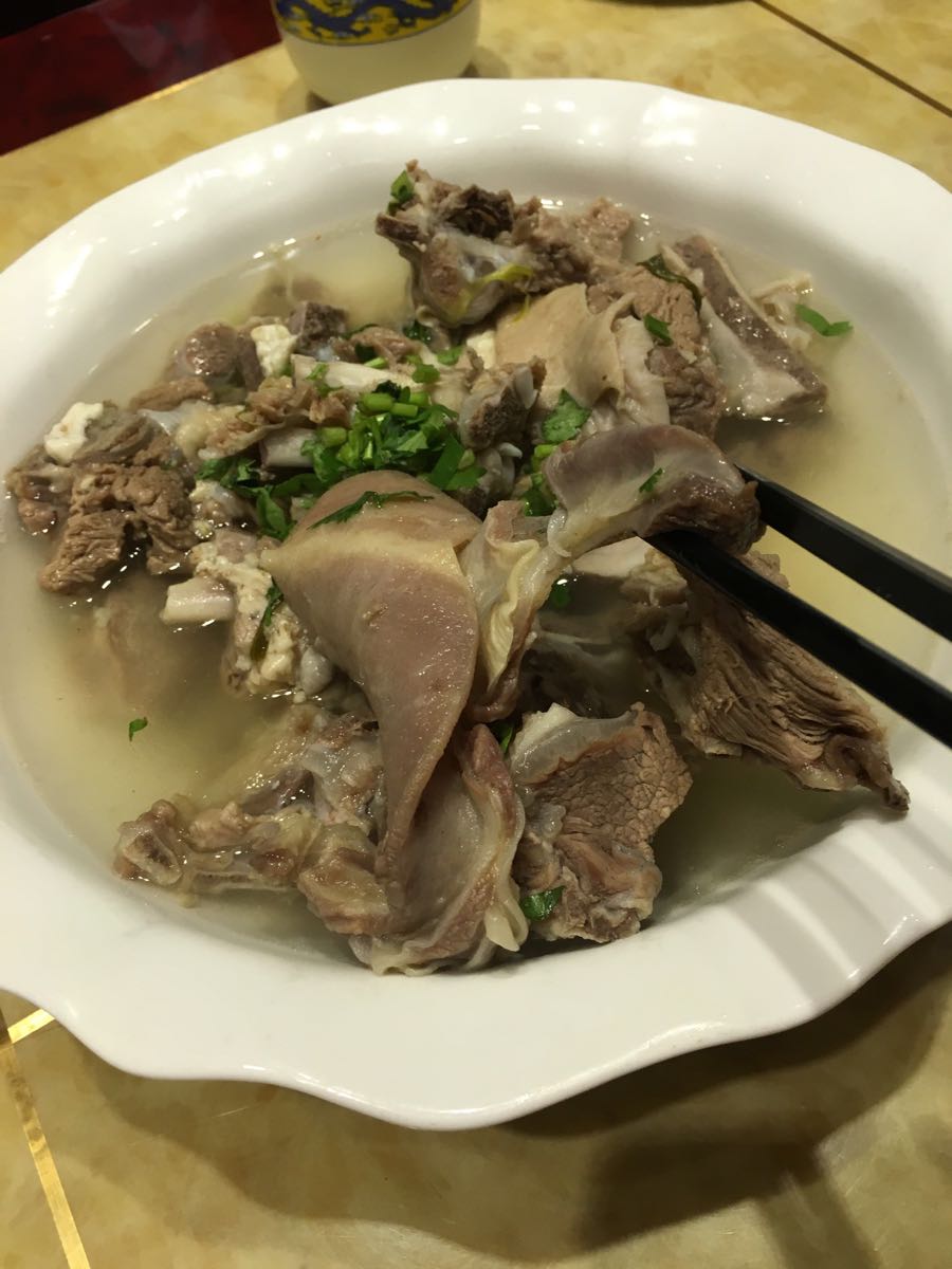 第一次来泰安,对这边不熟悉,在农业大学附近转悠找吃的,发现这家规模很大,应该是3层楼,而且客人很多,我们又喜欢吃羊肉,所以就敲定了这家,点了泰安三美汤,一个炖羊排,一个土豆丝,10串羊肉串,一个牛肉沫,大概是这些,感觉口味都不错,我姨都没吃够,第二天还想去,哈哈