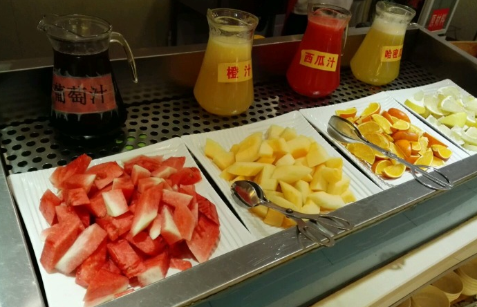 华联星帝酒店在西市场华联酒店的六楼,本来以为自助餐是自助火锅或者烧烤的,原来是自助餐,以熟食为主,附加小火锅,素菜不很新鲜,青菜叶枯叶黄叶不少,海鲜种类还可以但是不很新鲜。牛羊肉少只有切片的那种。羊蹄和排骨味道不错,粥品不甜味道合口味。水果种类少但是还算新鲜。39一位自助餐