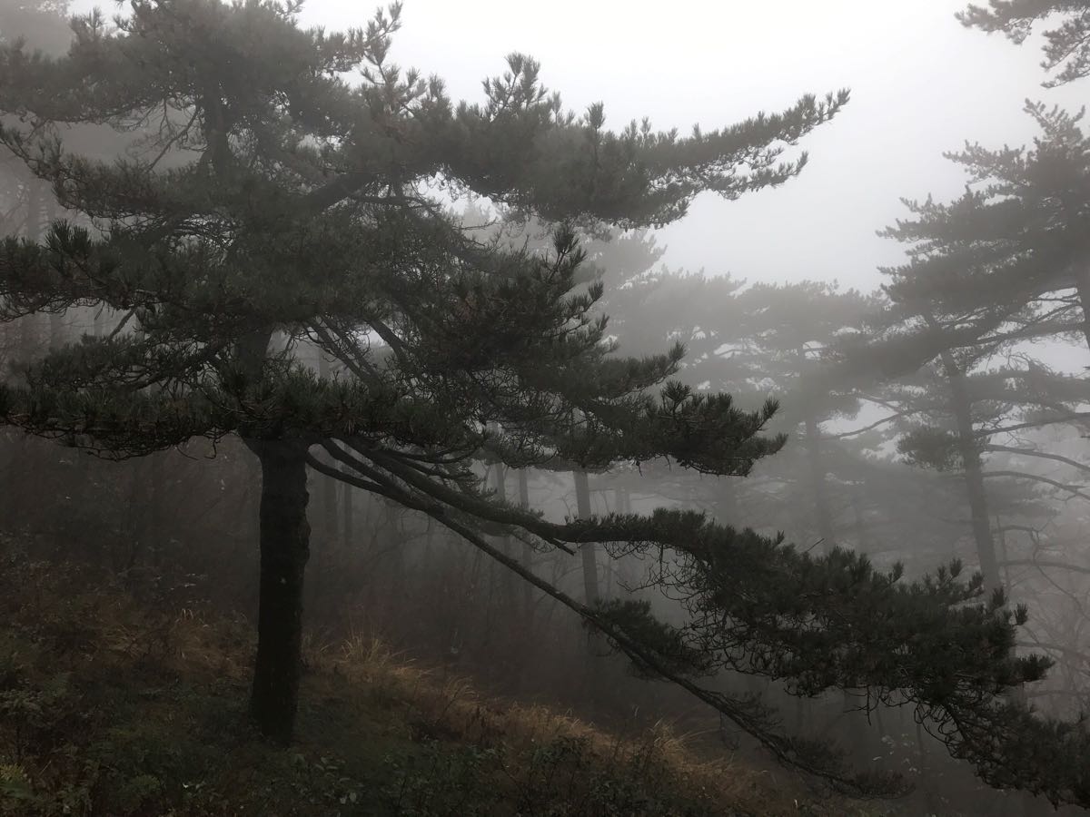 赶上下雨,什么峰都看不见,也就能看到路过的松树。一路有蒲团松、松科松、迎客松还有这孔雀松。